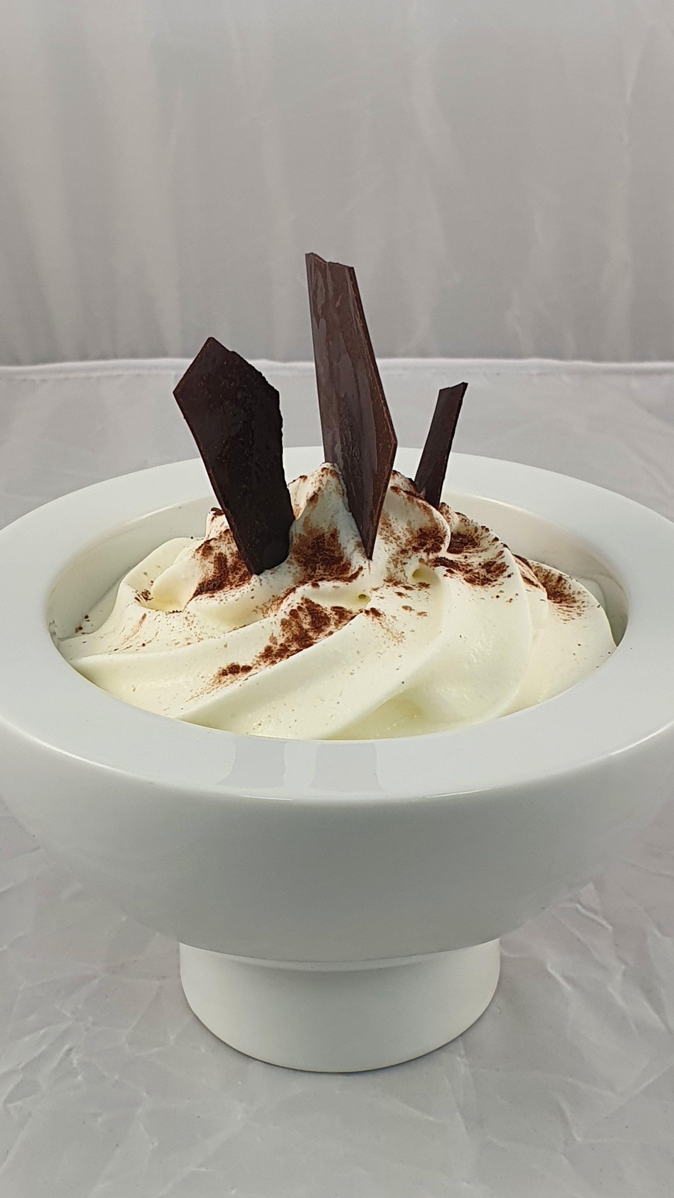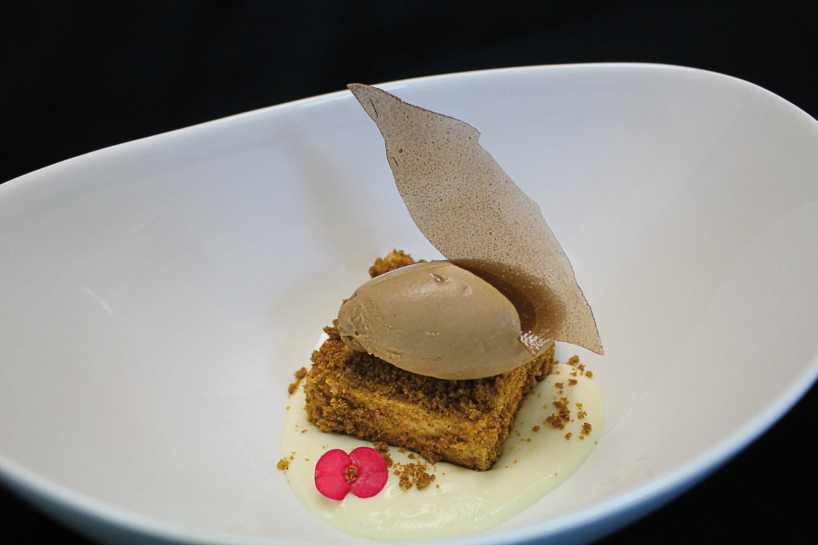 HELADO DE CHOCOLATE NEGRO SOBRE GALLETA DE MASA BRISA Y ESPUMA DE LECHE. - 6,00€