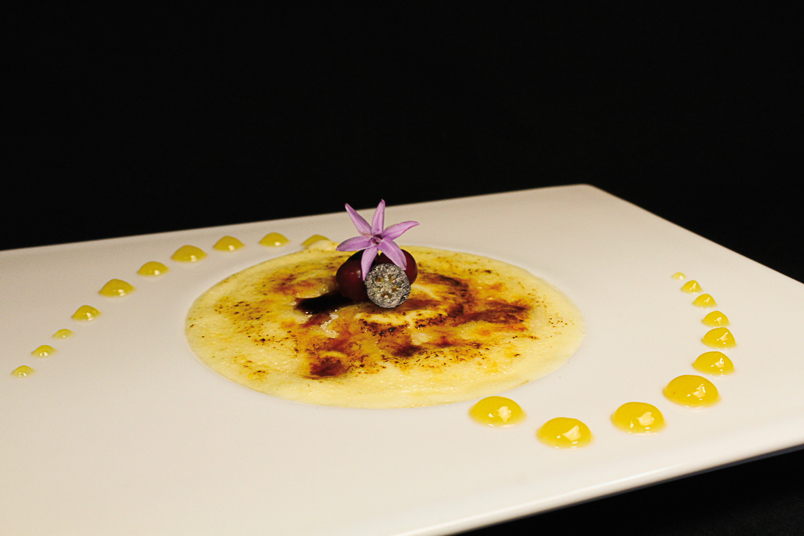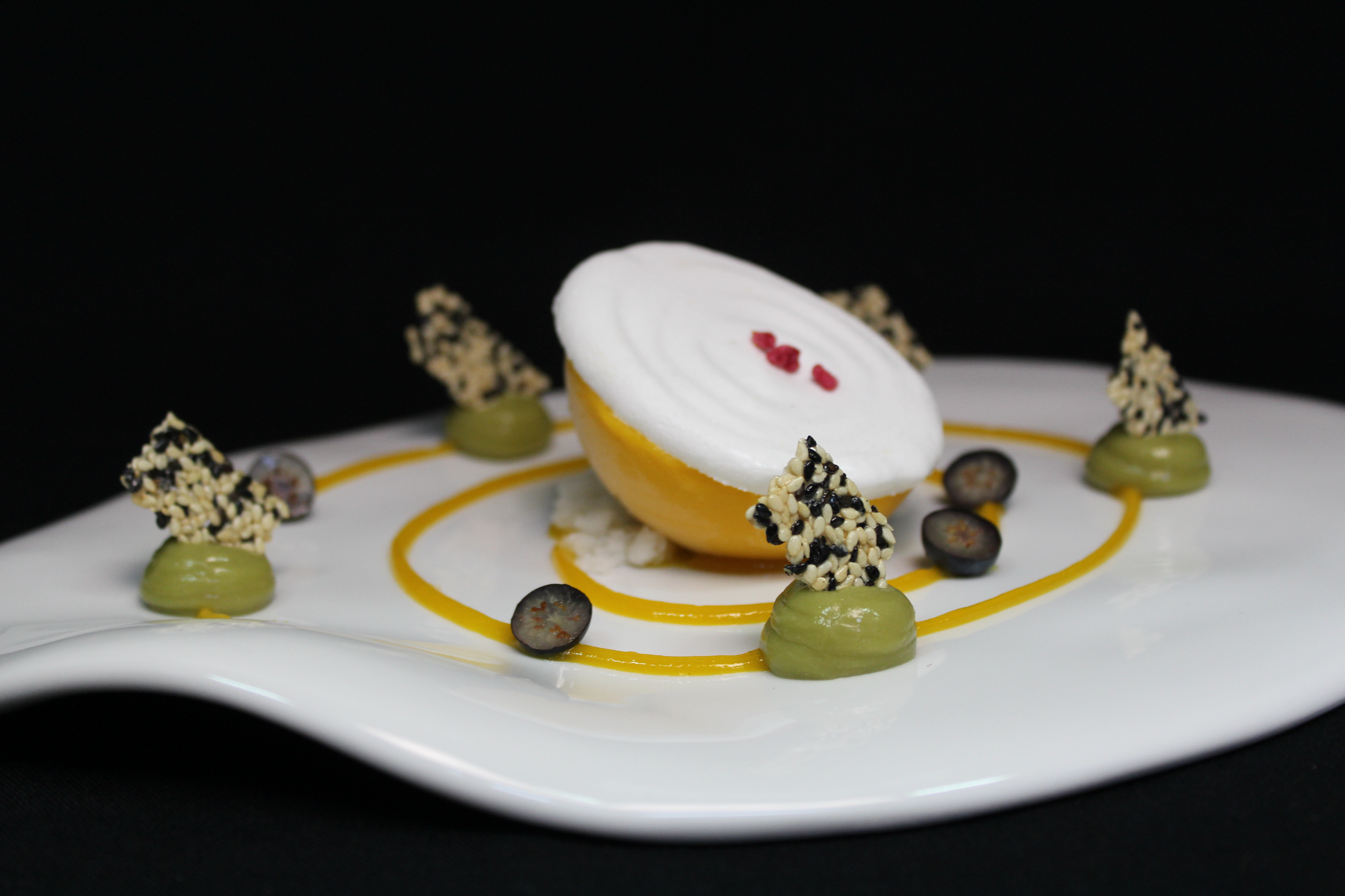 SEMIESFERA DE SORBETE DE MANGO SOBRE NIEVE DE LIMON, MERENGUE BISCUIT, COULIS DE PASION, POMADA DE AGUACATE Y TEJA DE SESAMO. - 6,00€