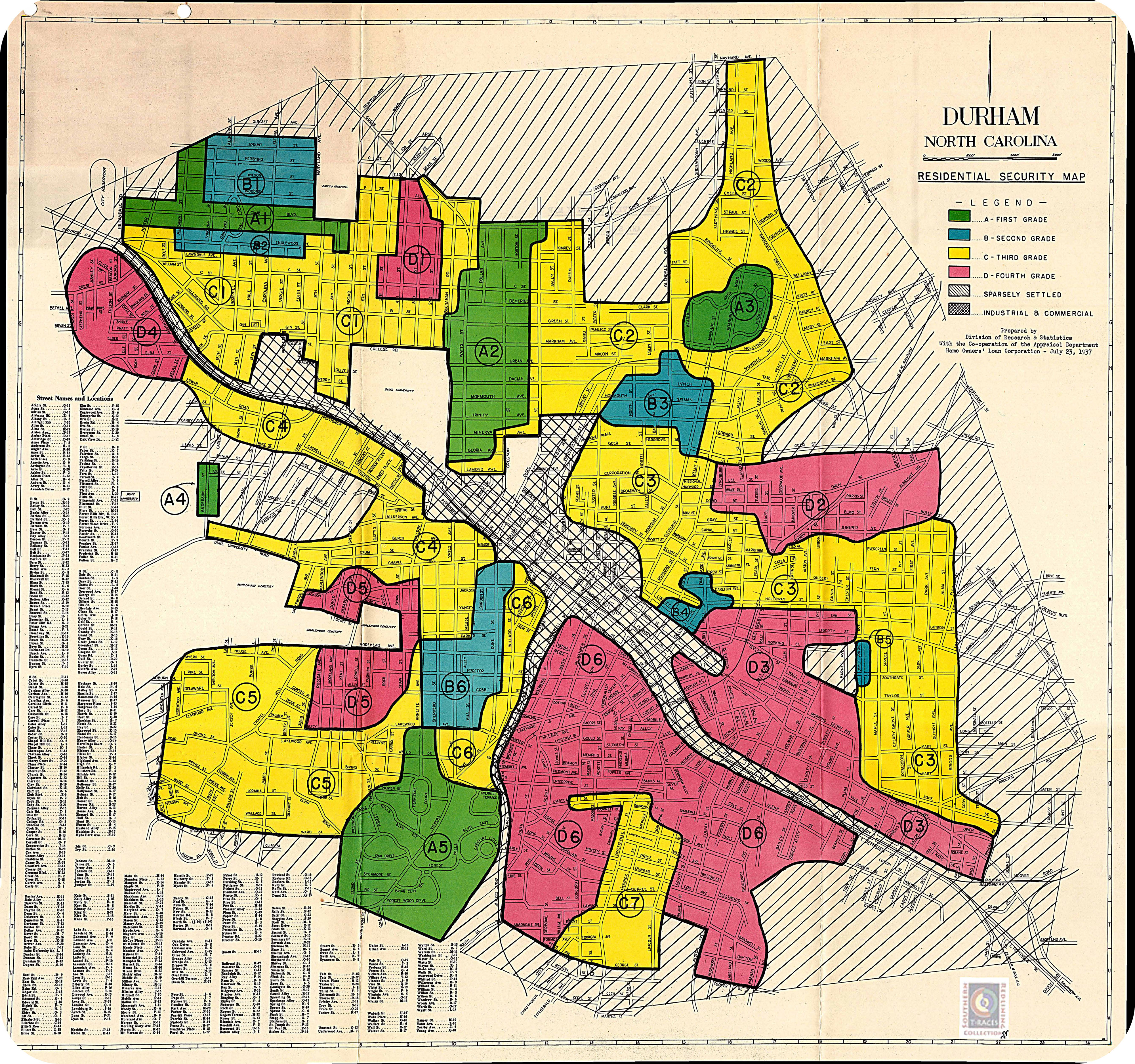 This map (left) was created in 1937 for the Federal Housing Administration to judge the investment risk or security of city neighborhoods. Cities across America were assessed, including Durham. Many of Durham's black neighborhoods and mill villages were given the lowest grades.
