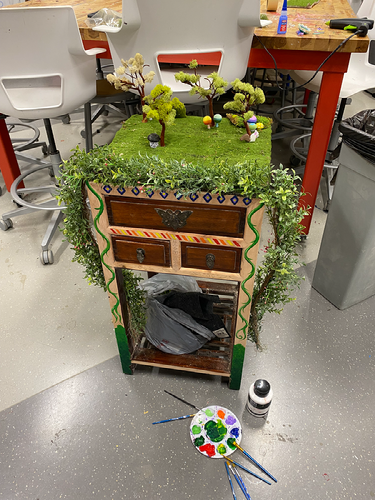 After printing all these 3D prints I sanded down the table I had acquired to remove the varnish as varnish stripping it would have been a messy process full of chemicals. I also bought more supplies from Michaels to add more realistic vibes to balance out the creative chaos and strive for harmony. Below is a picture of how I wanted to incorporate these pieces with the table.