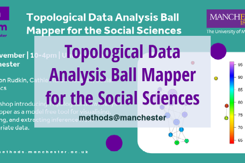 This workshop introduces the Topological Data Analysis Ball Mapper algorithm as a model free tool for visualising data and is led by Dr Simon Rudkin. Dr Rudkin is a member of the University of Manchester's Cathie Marsh Institute for Social Research (CMI) and his work has pioneered application of Ball Mapper in the social sciences. The workshop will showcase the strengths of the algorithm and the research opportunities available for exploitation.