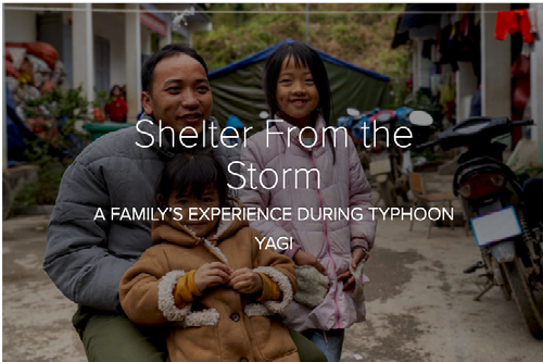 Nine households evacuated from the mountainside that night to find shelter. Now, their children play among the temporary shelters and food aid provided by the Vietnamese government. Everything they could save is packed into the small schoolroom they are living in. The storm destroyed their home and barn, including their livestock.