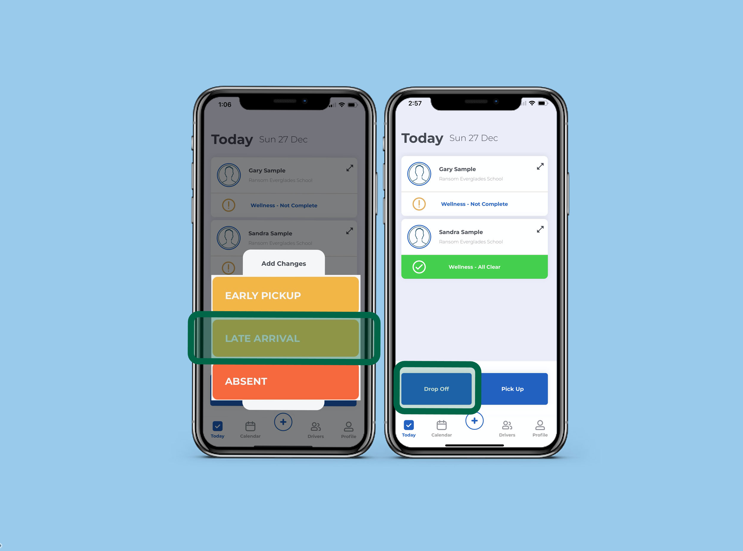 When arriving on campus to drop off the student, the parent should use the "drop off" option in the app to notify the school that the student is now on campus.