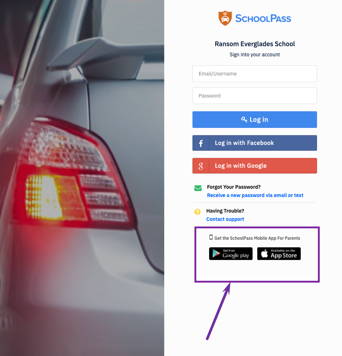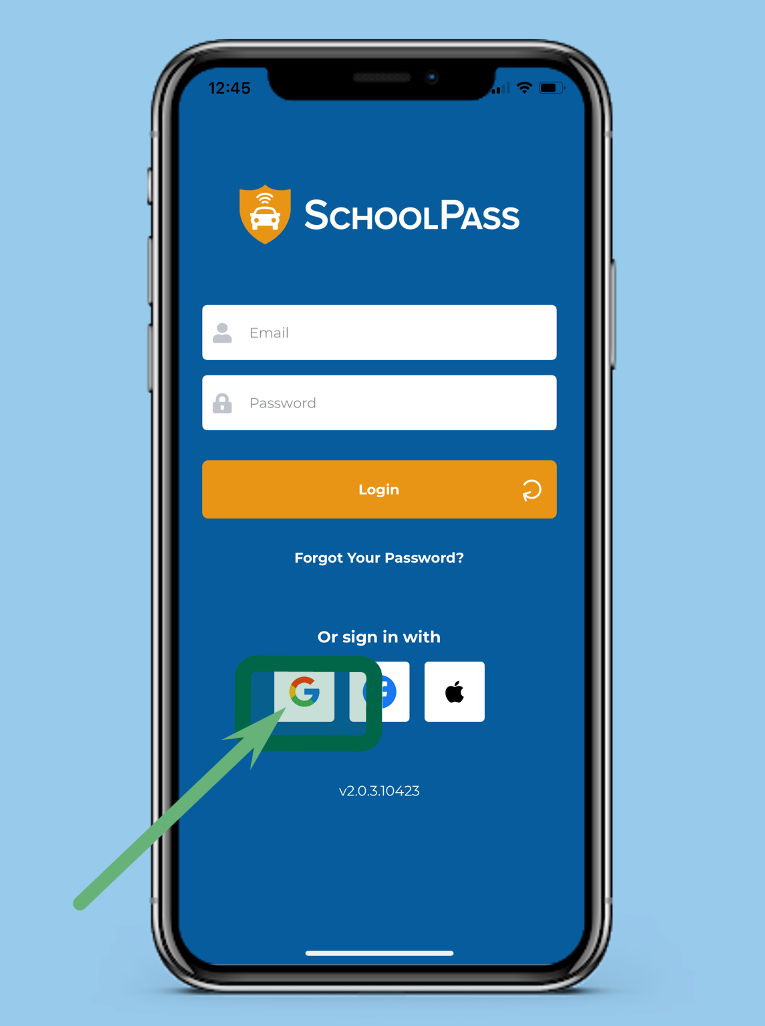 Your email account on file with the school is your SchoolPass login ID. If you have a Gmail address or Apple Mail account registered with the school, you can use the social login buttons.