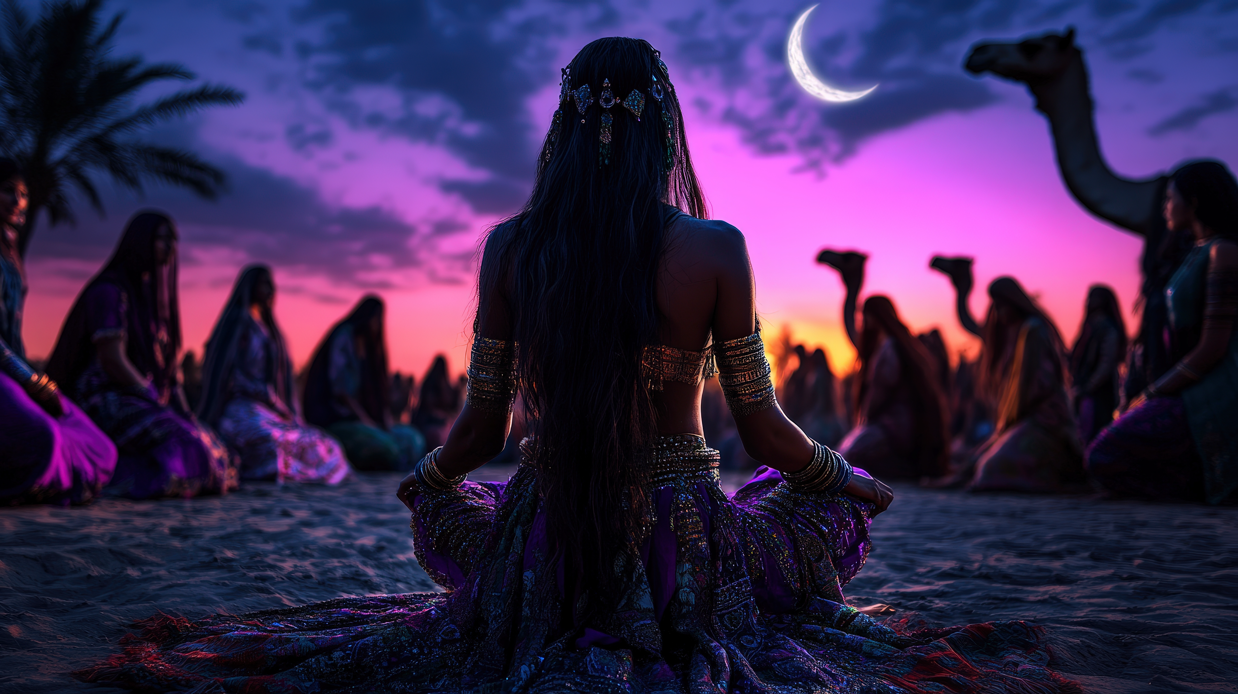 Created with images by Shelley - "A stunning night sky featuring a crescent moon and twinkling stars, with soft clouds creating a dreamy backdrop.,Ideal for Ramadan themes, with ample space for text." • Sujon - "Geometric flower of life pattern with glowing nodes and pastel gradient background design element" • Nikki Zalewski - "Healing Hands and Flower of Life Symbol Message Background - male parallel hands with white star light between against a golden Flower of Life background ideal for a spiritual holistic healing theme" • W.O.W - "Flower of life sacred geometry symbol on pastel unicorn rainbow colored background.,Spiritual meditation and holistic healing concept for wellness." • belyaaa - "Hands holding green plant for gardening.,New life and hope concept image." • DKPhoto - "Women in vibrant attire gather under the crescent moon in a desert landscape, evoking thoughts of unity and connection as they share stories amid the enchanting evening."