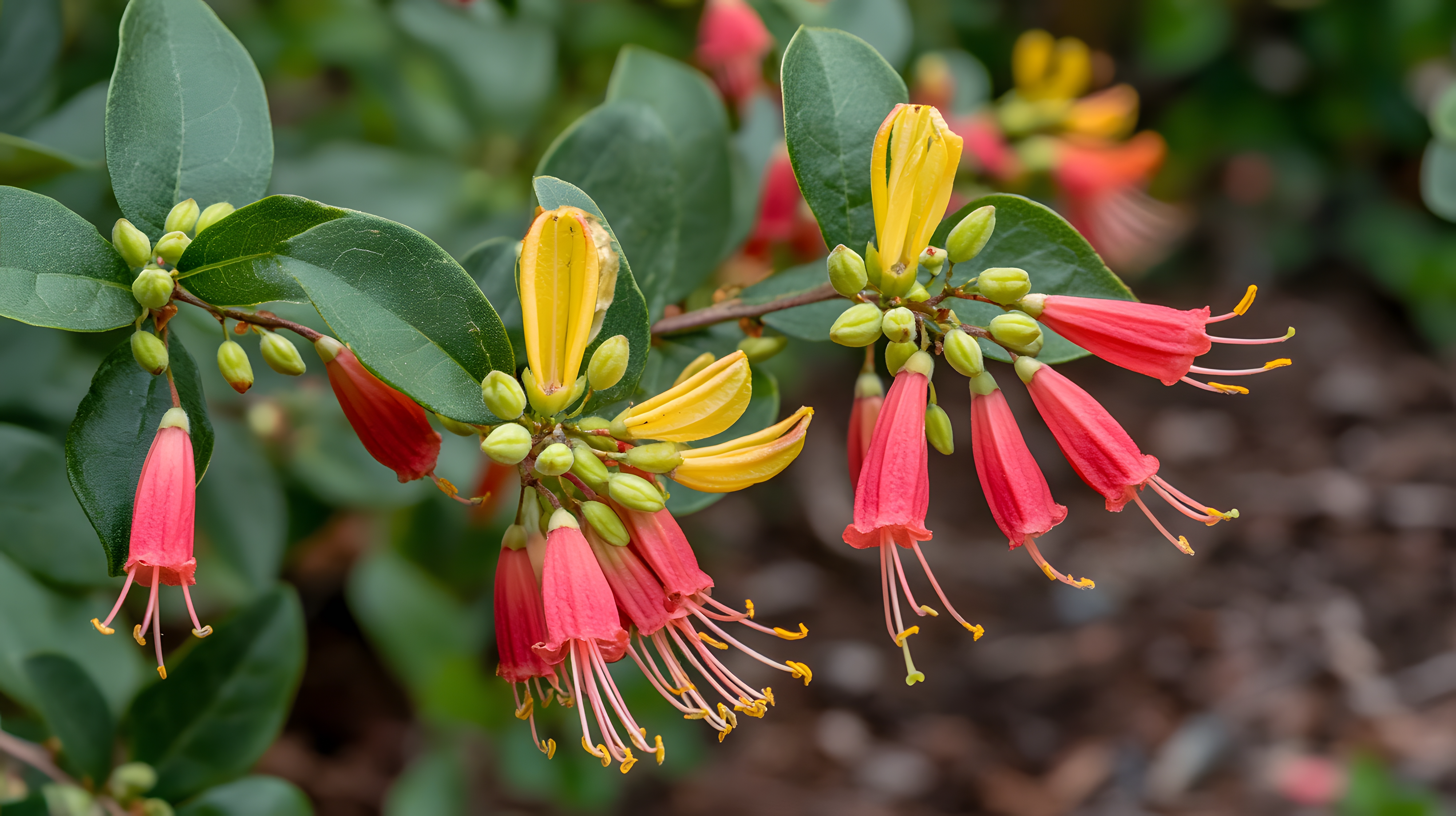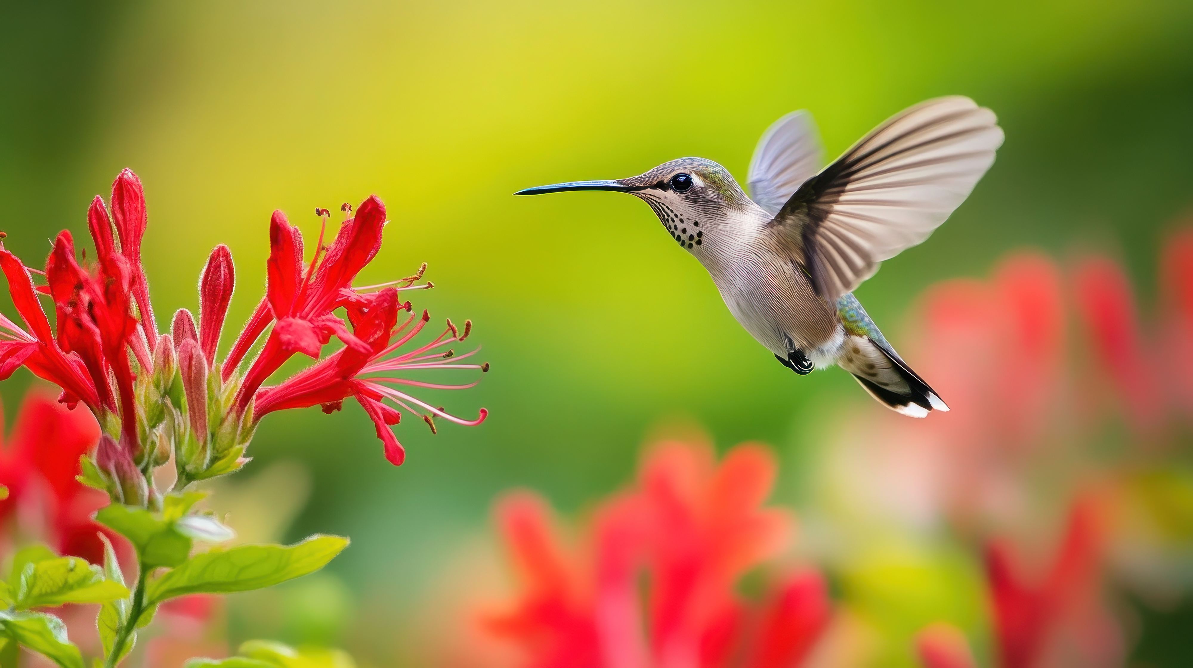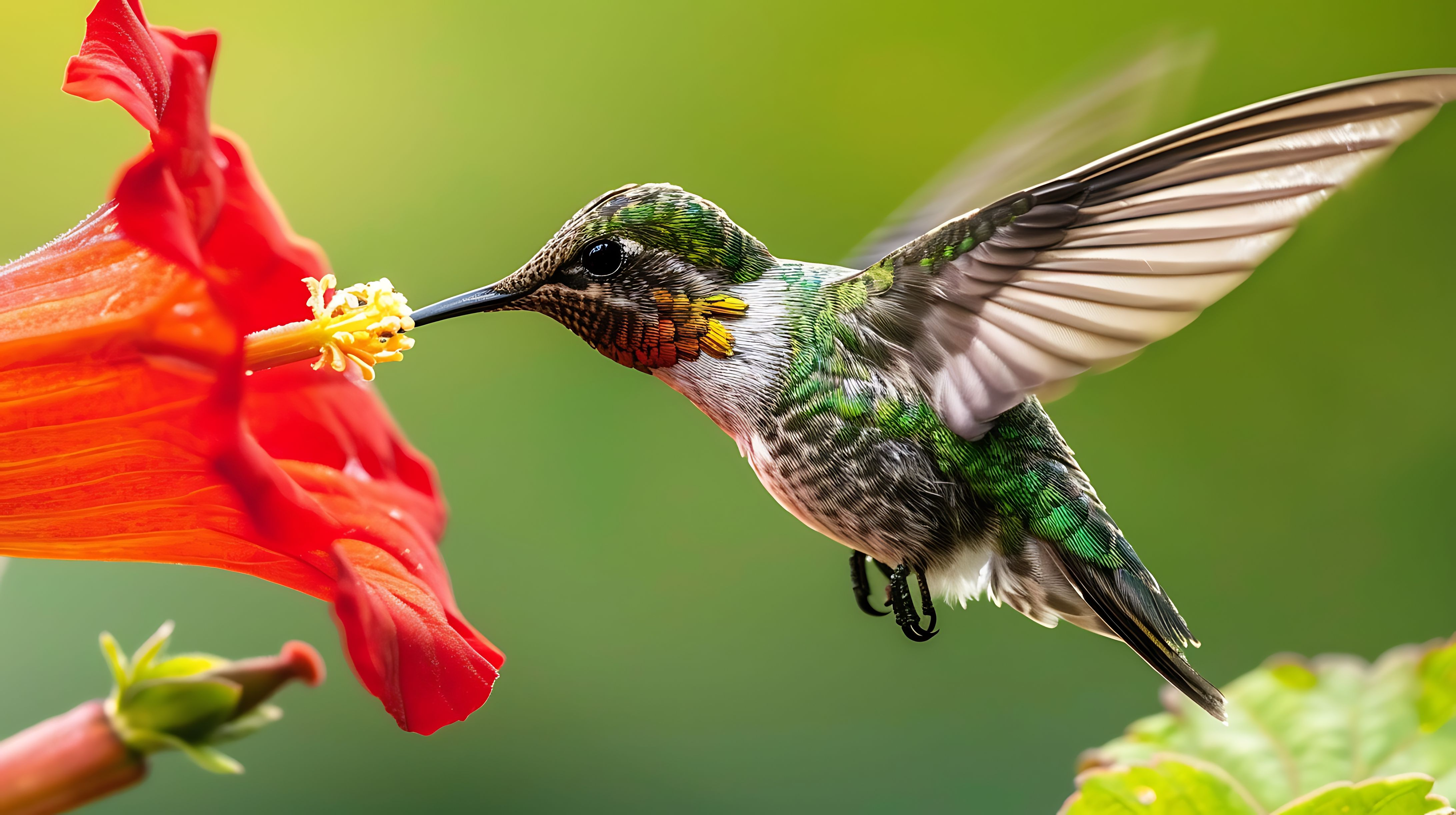 Created with images by EnbeAi - "Hummingbird's Nectar Quest: A Delicate Dance Amidst Red Trumpet Flowers" • Sme - "Vibrant Red and Yellow Honeysuckle Flowers Blooming Bush" • Premium Graphics - "Macro shot of rubythroated hummingbird hovering midair sip nectar vibrant red trumpet vine flower"