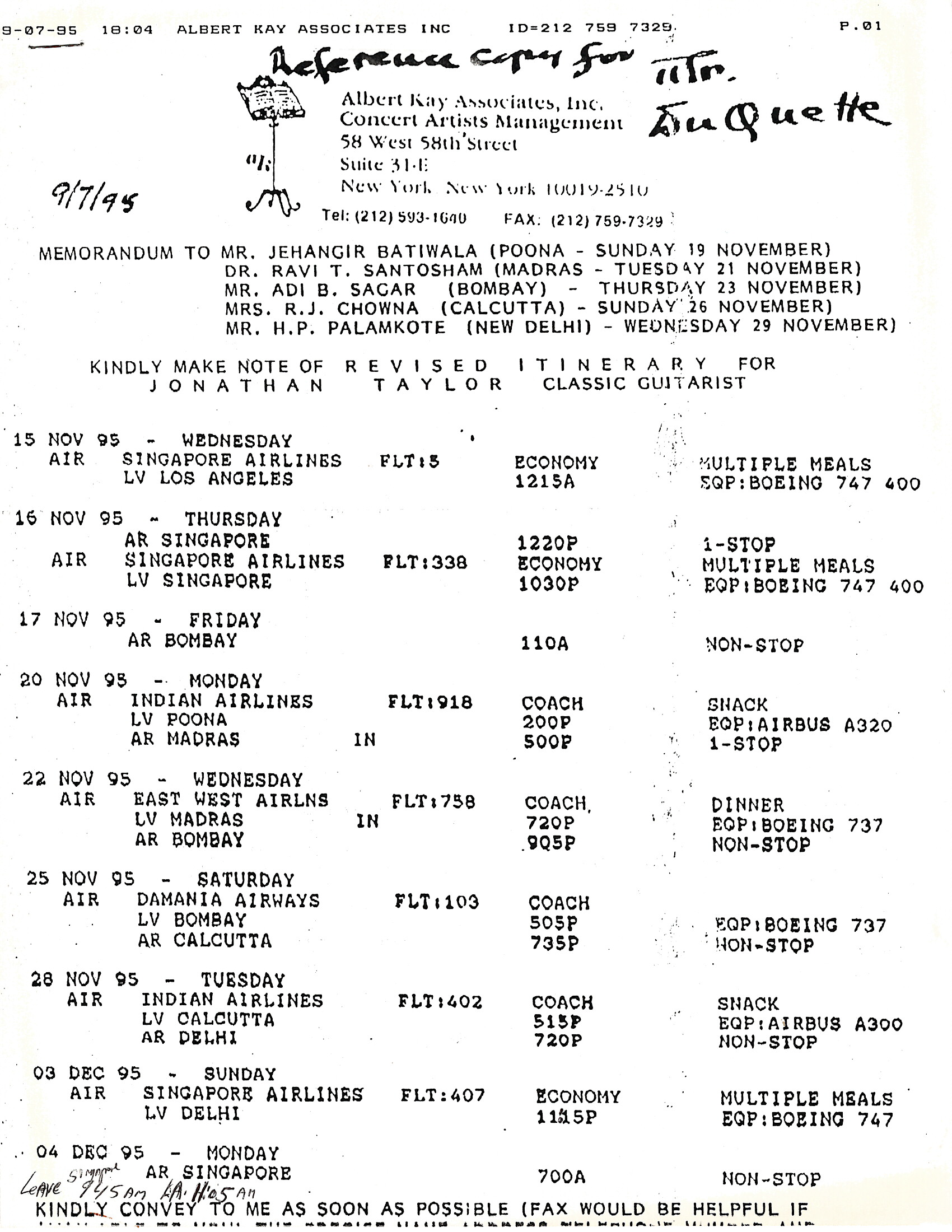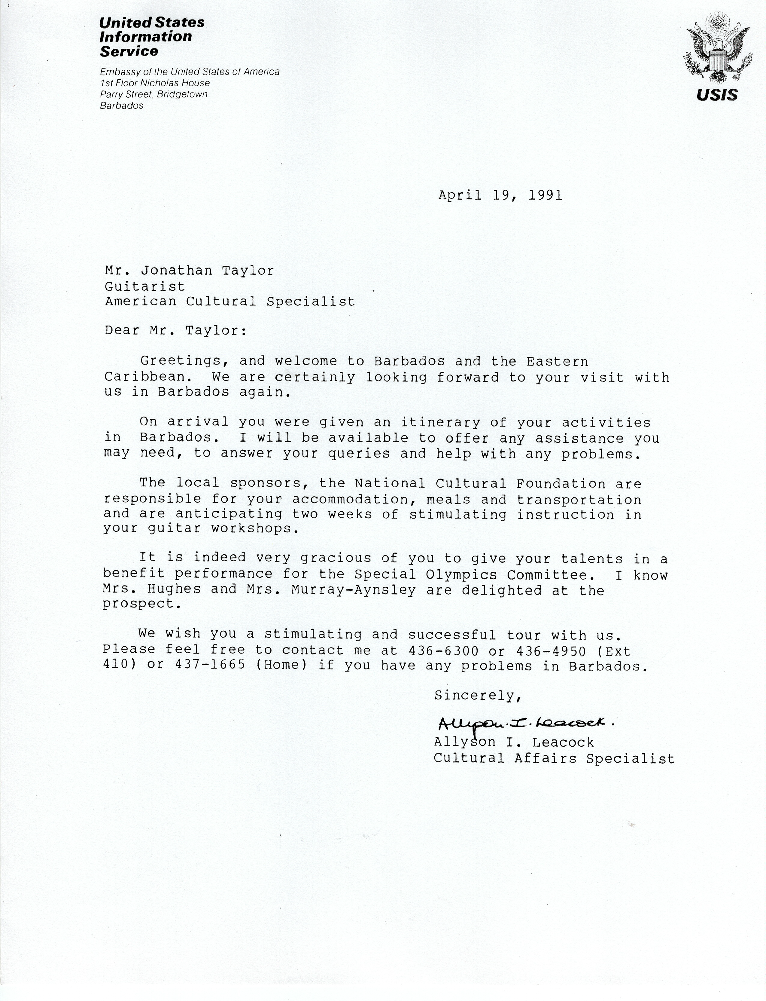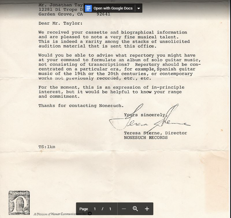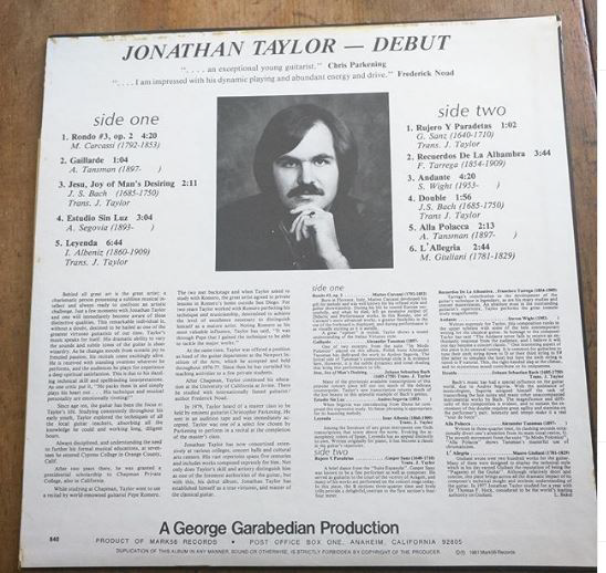 Taylor also achieved distinction in Master Classes with the great American Virtuoso Christopher Parkening in 1979 "An Exceptional young guitarist" -Christopher Parkening