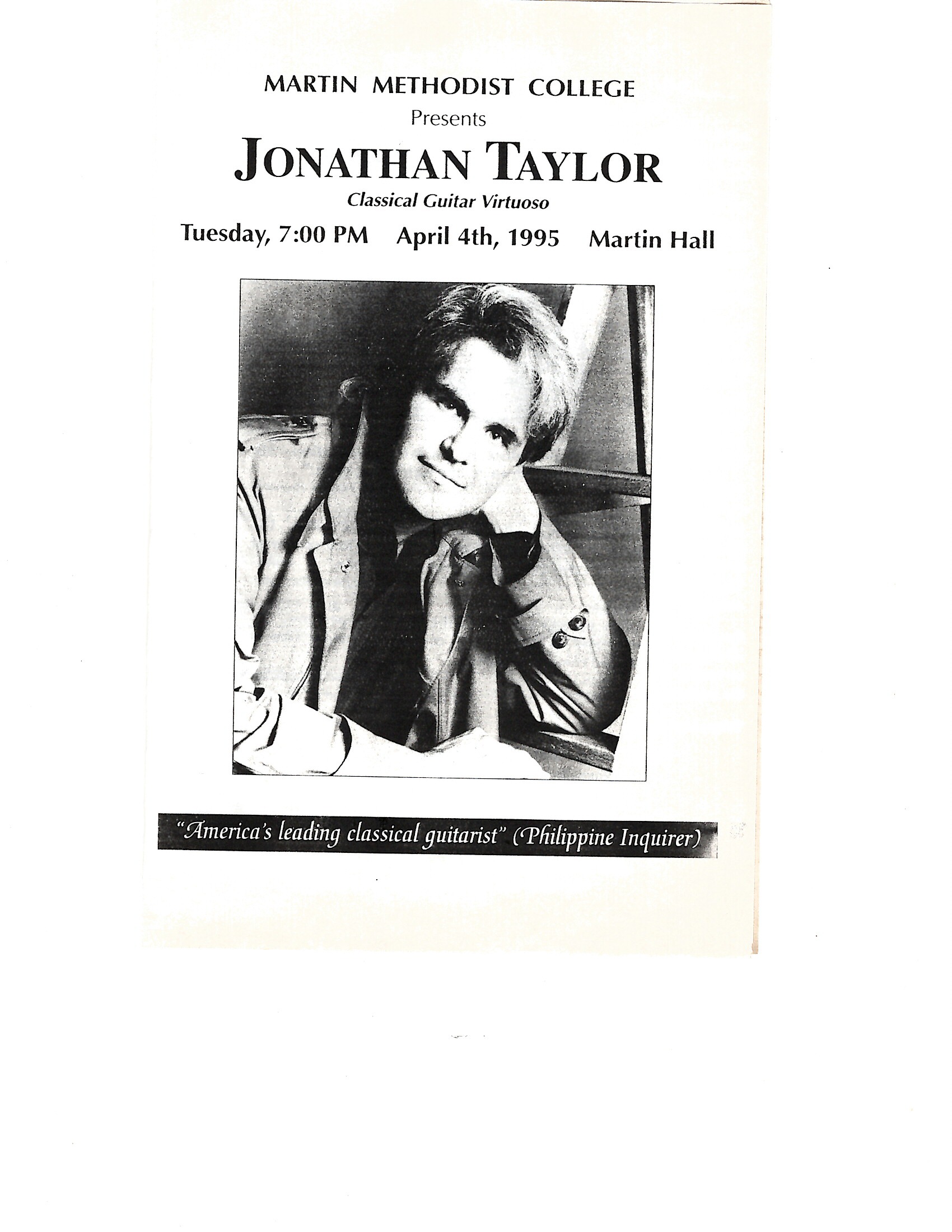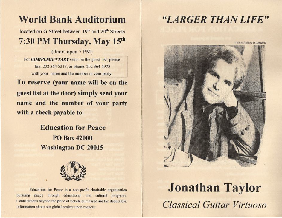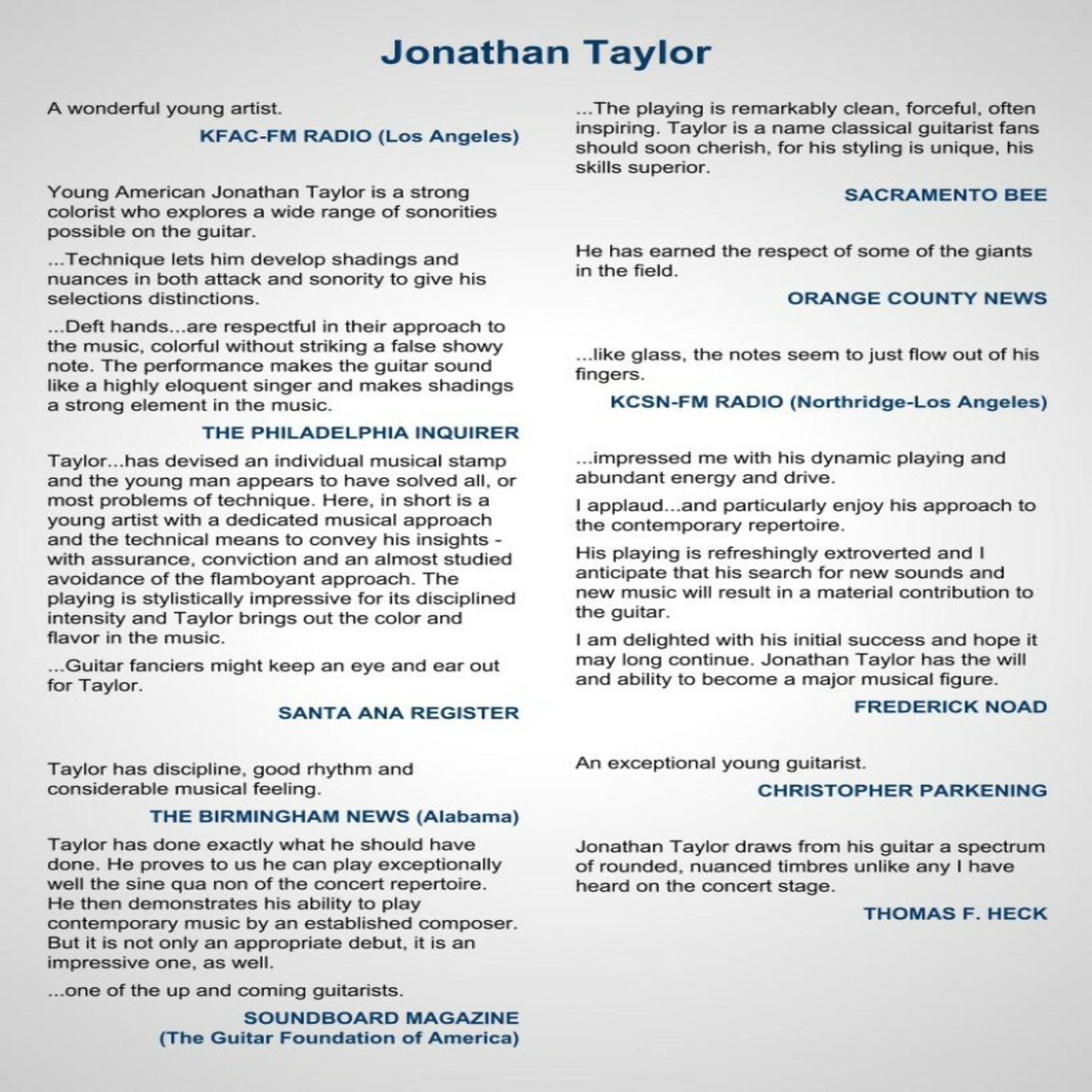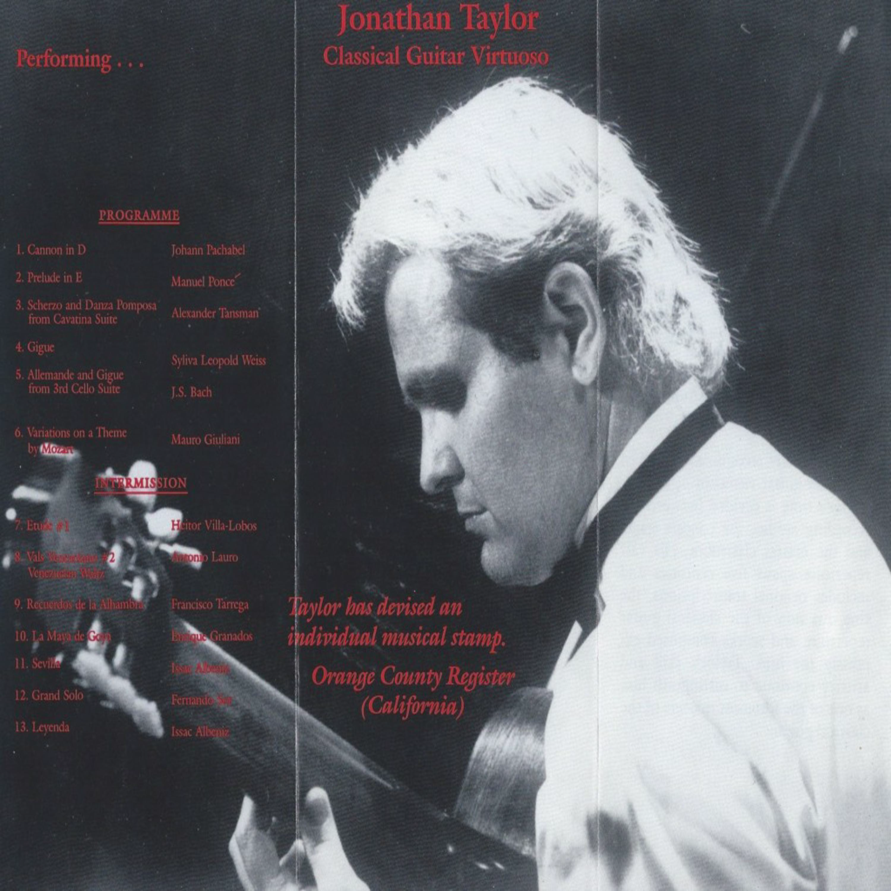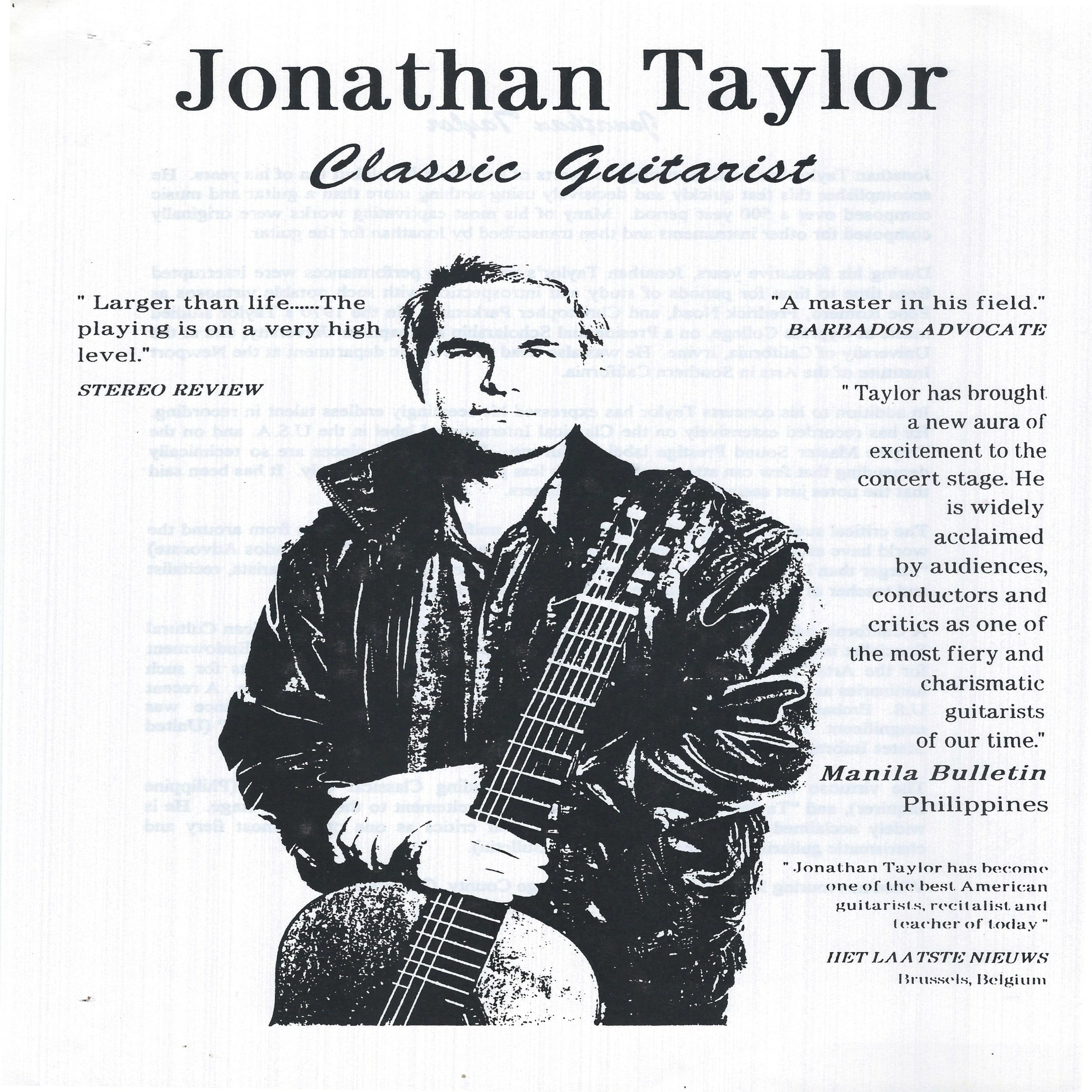He has performed sold-out concerts for such luminaries as UN delegates American Ambassadors and foreign heads of State.During his formative years in the 1970s and 80s Taylor studied music at Chapman University on full Presidential scholarship and was head of the music department at the Newport Institute of the Arts in Southern California. He studied privately for years at the home of the great virtuoso Pepe Romero and was also was a private student of Frederick Noad whose PBS series was a staple of American life. Noad was a founding member of the Guitar Foundation of America and authored the classic book "Solo Guitar Playing" "Jonathan Taylor has the will and ability to become a major musical figure" -Frederick Noad (1981)