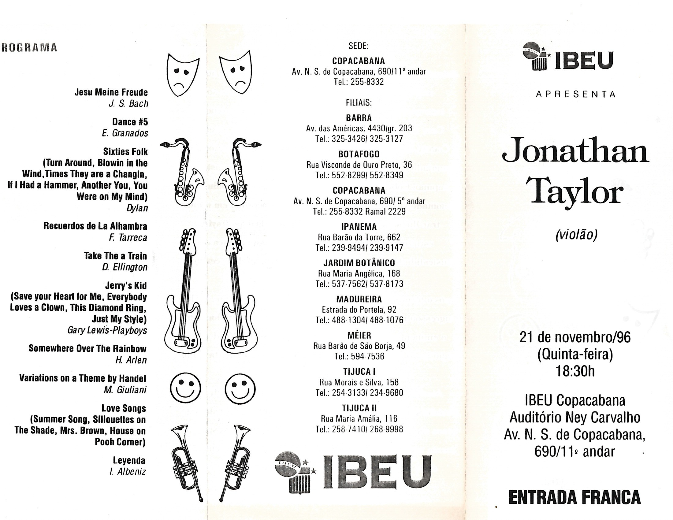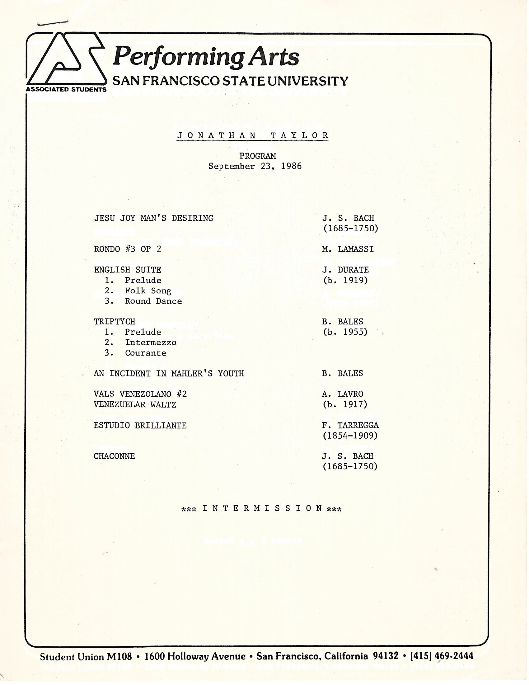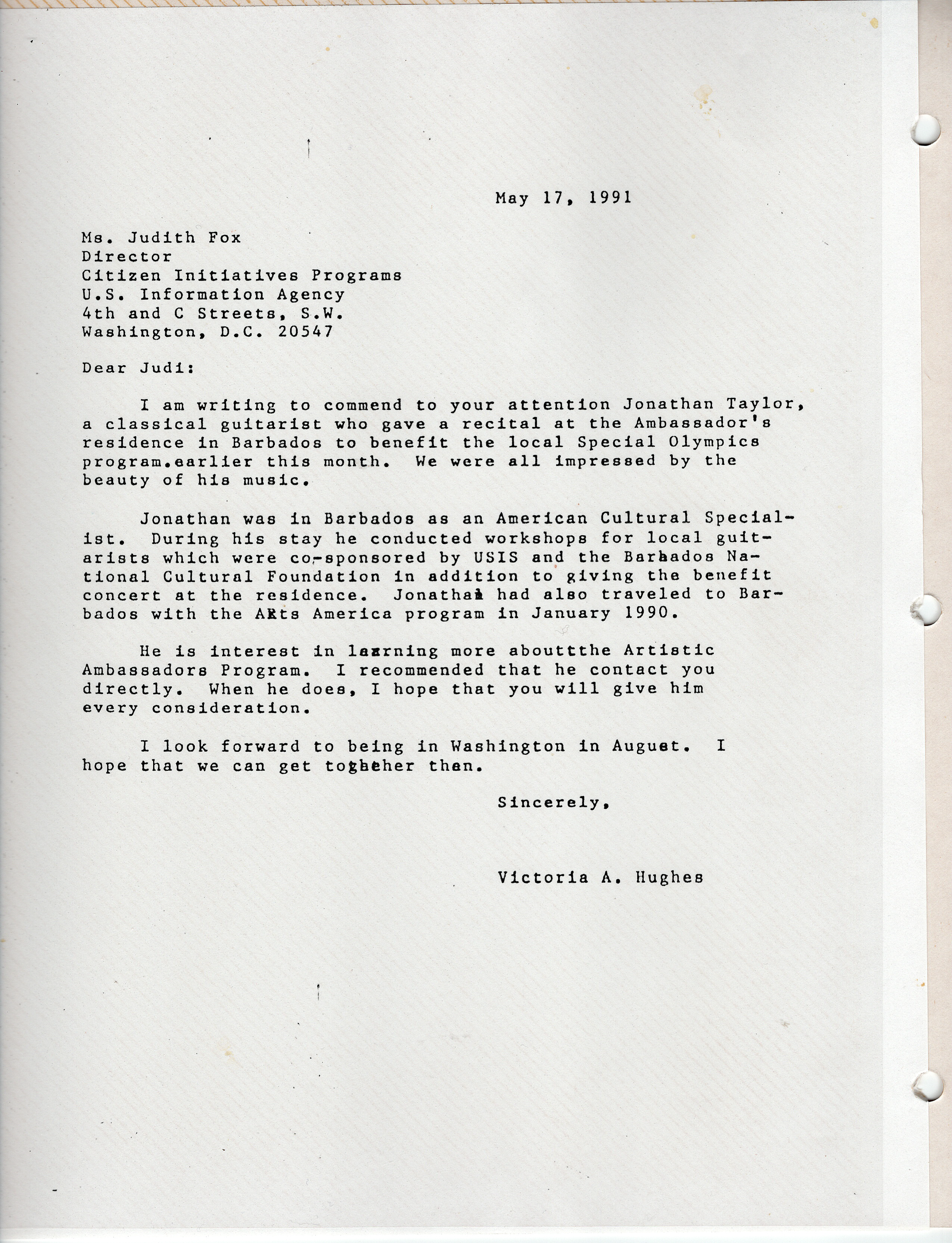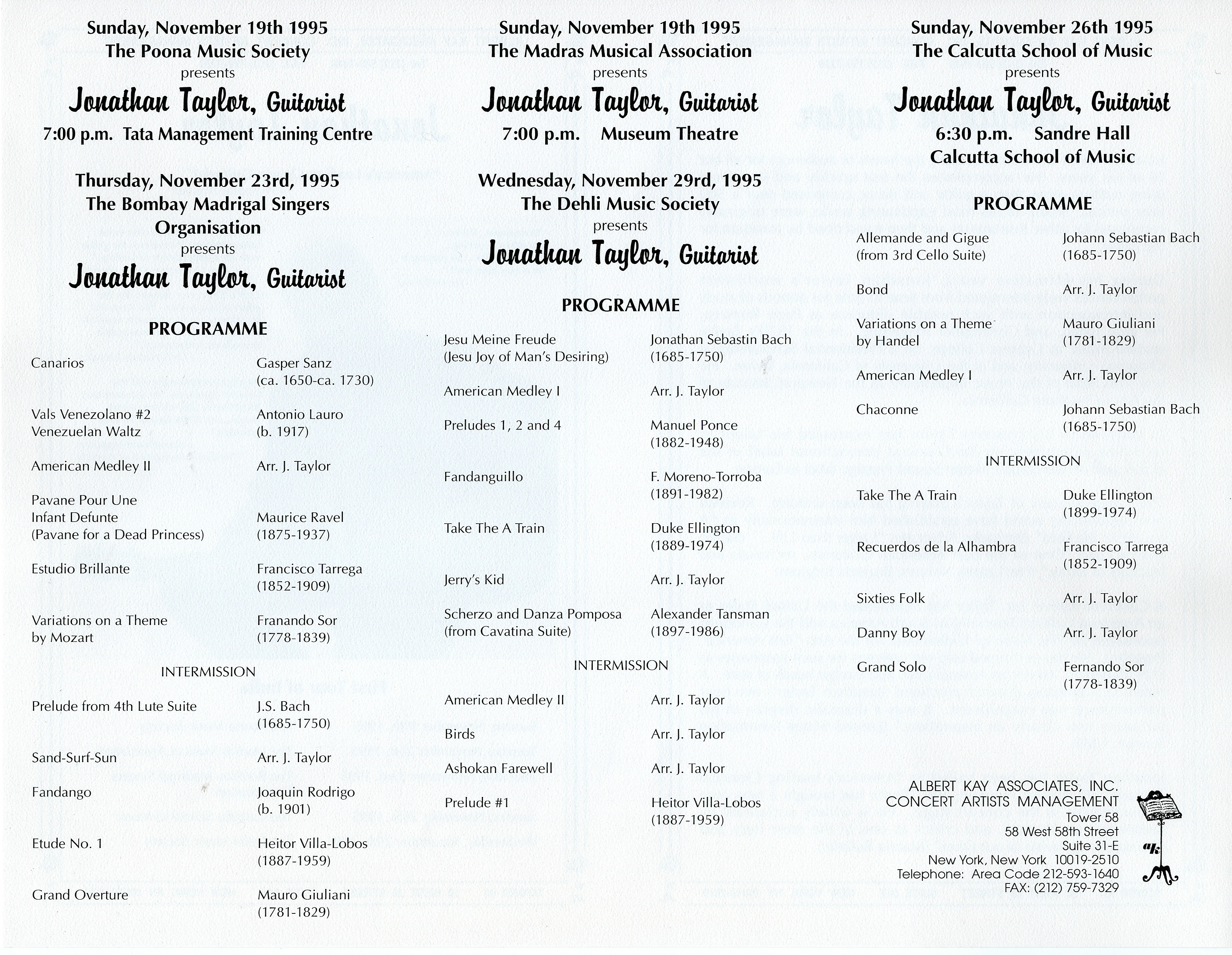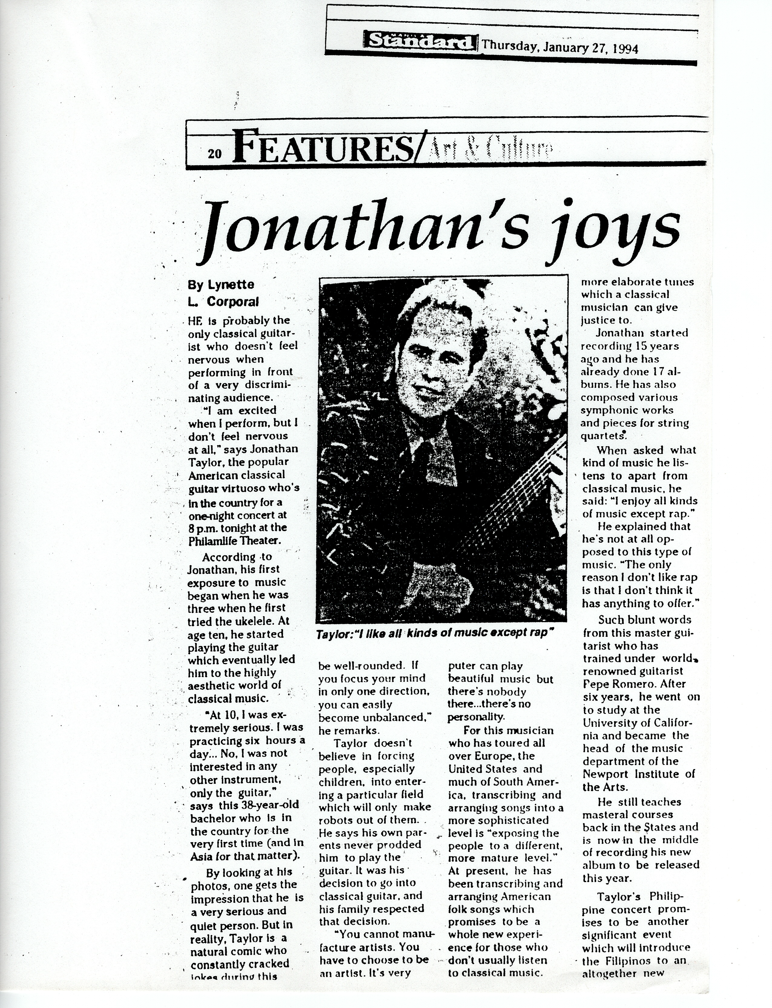 He has performed sold-out concerts for such luminaries as UN delegates American Ambassadors and foreign heads of State.During his formative years in the 1970s and 80s Taylor studied music at Chapman University on full Presidential scholarship and was head of the music department at the Newport Institute of the Arts in Southern California. He studied privately for years at the home of the great virtuoso Pepe Romero and was also was a private student of Frederick Noad whose PBS series was a staple of American life. Noad was a founding member of the Guitar Foundation of America and authored the classic book "Solo Guitar Playing" "Jonathan Taylor has the will and ability to become a major musical figure" -Frederick Noad (1981)