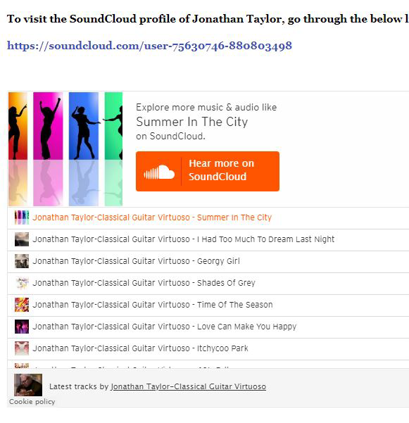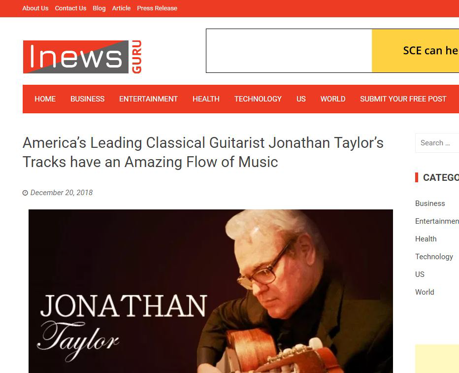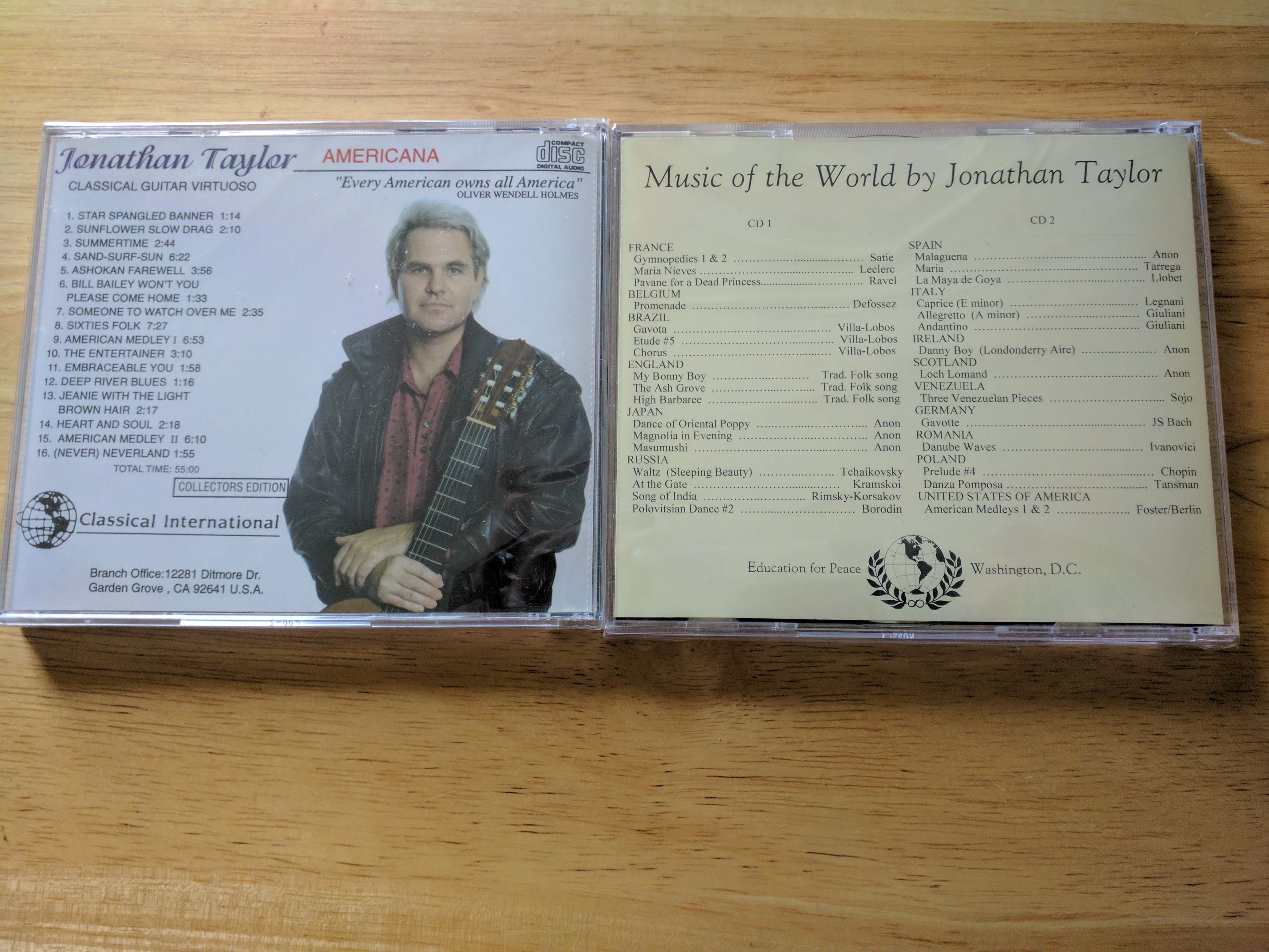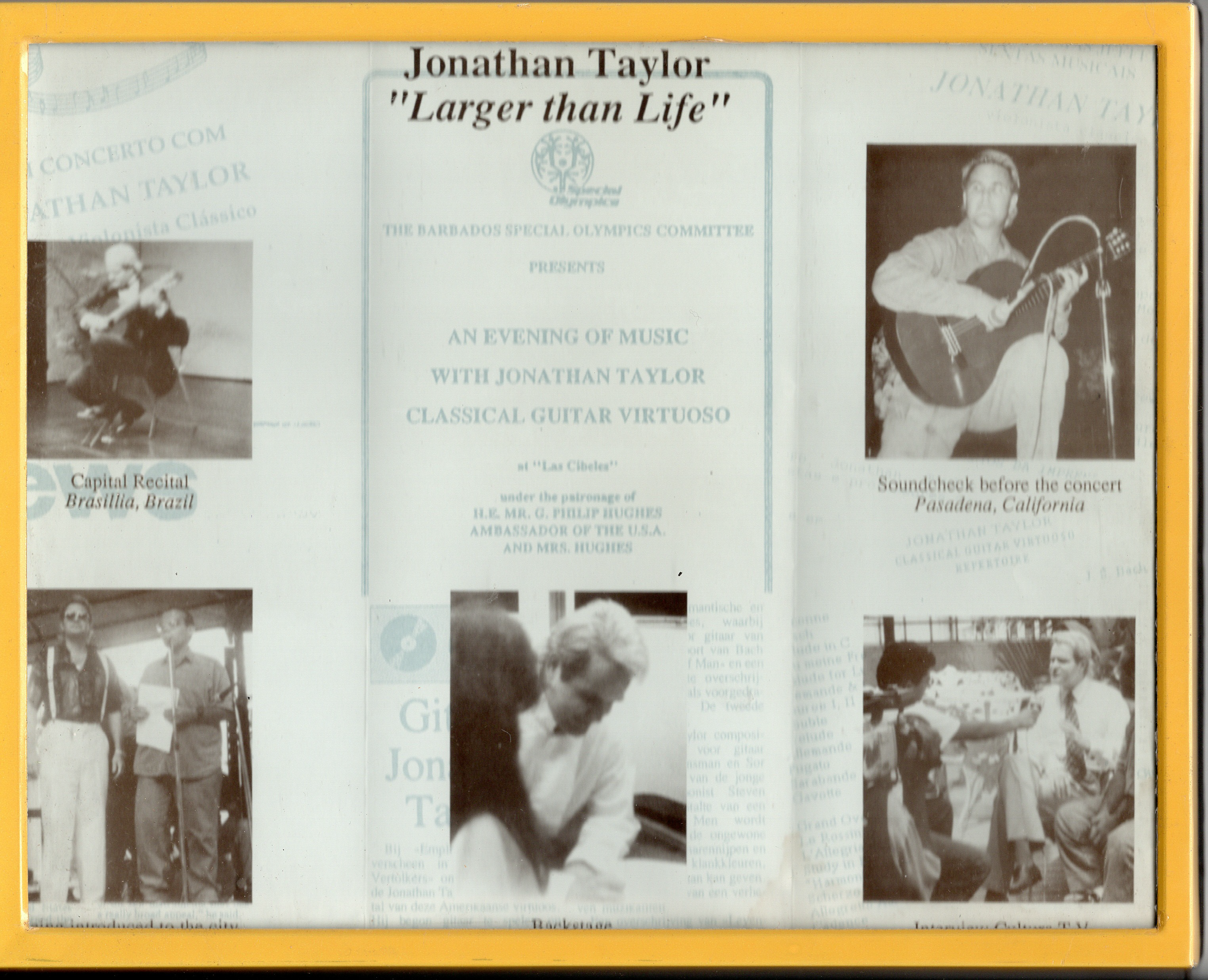 Taylor has had a long and distinguished career. He is known for his virtuosity and unique transcriptions and adding materially to the guitars repertoire. Mr. Taylor performed extensively for years throughout Europe, North and South America and Asia.. Mr. Taylor was a ground breaker and saw the digital age coming He was one of the 1st artists to record digitally back in the early 1990's. He set about creating a Catalog (over 300 Tracks) that have few if any equals. The Beatles have recorded less material than Mr. Taylor. His music is streaming Worldwide on ITunes, Spotify, Pandora, Amazon Music, Sirius Radio and most streaming services everywhere. If you type Jonathan Taylor Guitar into Google you will find him. When not touring Mr. Taylor resides in Huntington Beach California