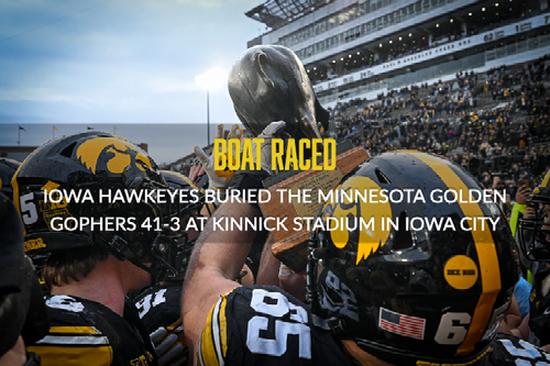 This time, there would be no debate to decide the game whatsoever. The Hawkeyes thoroughly dismantled the Gophers in all three phases of the game. Fueled by a Zach Lutmer pick six, a 29-yard strike in the end zone from Mark Gronowski to Reece Vander Zee, and a 50-yard punt return taken to the house by Kaden Wetjen, the Hawkeyes exploded for 41 points while only giving up 3.
