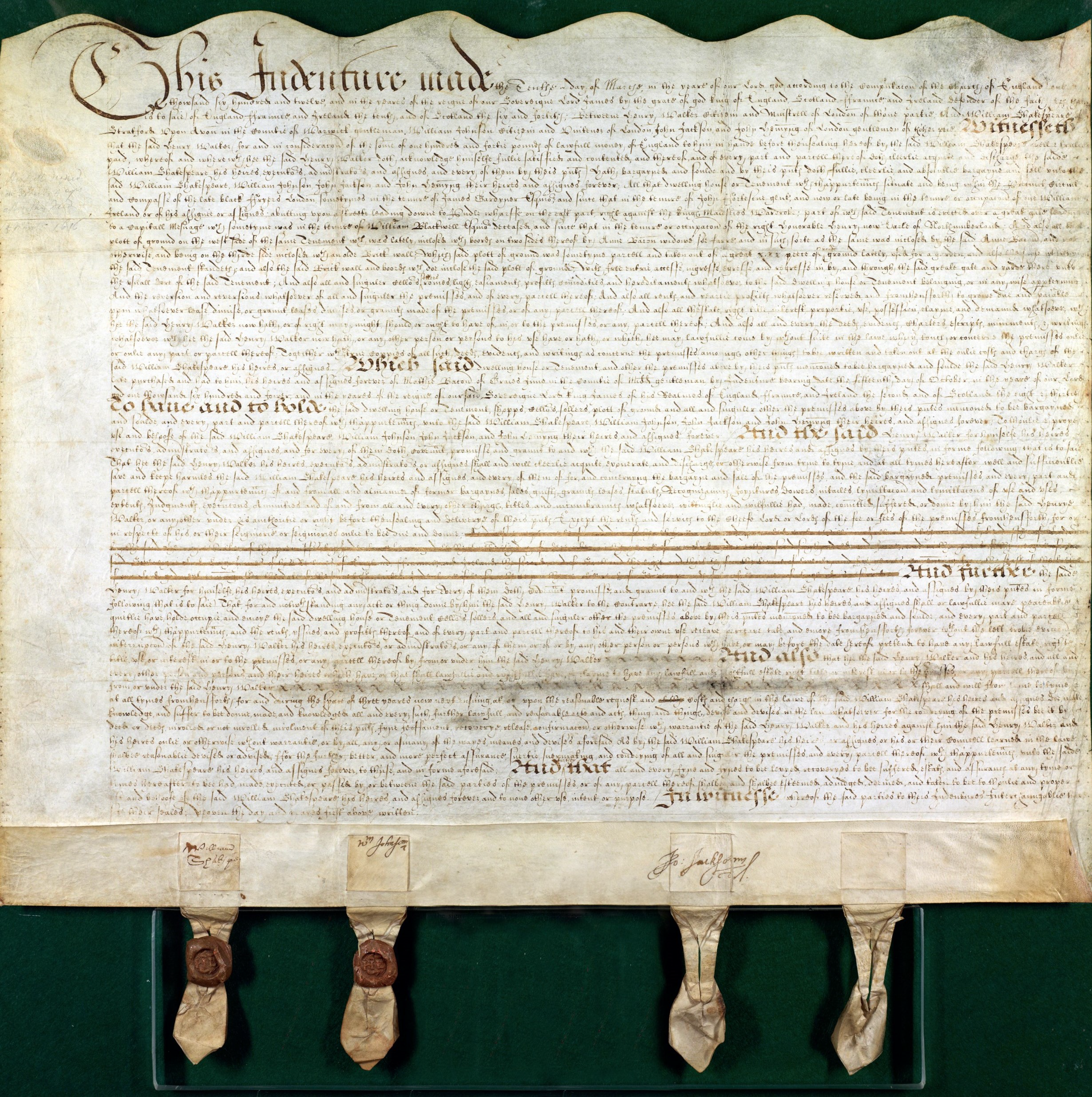 In March 1613 William Shakespeare and three associates agreed to purchase the Gatehouse of the former Dominican priory in London known as “Blackfriars” from Henry Walker for the sum of £140. The indenture of bargain and sale is dated March 10. The same group agreed to a mortgage, dated March 11, for the property in the amount of £60, implying that the buyers put up only £80 at the time of sale. A well-documented purchase.