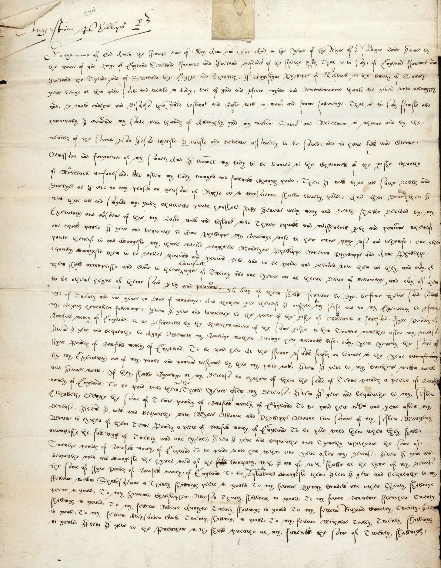 Augustine Phillips was a long-time member of the same playing company as William Shakespeare—the Lord Chamberlain’s and later the King’s Men. Phillips’ will, dated May 4, 1605, provides insight into two important aspects of the company’s operations. First, it provides a nearly complete roster of the King’s Men in May 1605. Second, provisions of the will provoked lawsuits which help document the history of the Globe playhouse. Other 17th Century Legacies.