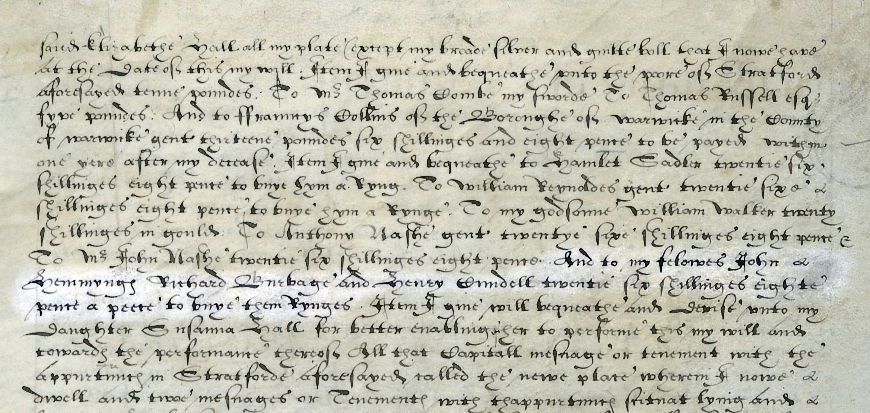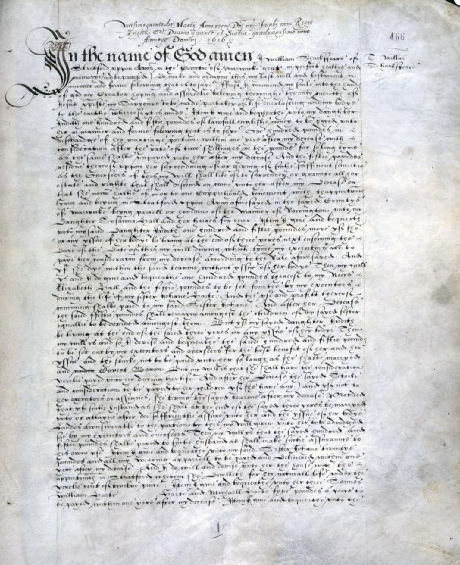 The registered copy of Shakespeare’s last will and testament is shown here. The original will was probated on June 22, 1616, and entered in the register shortly thereafter. After Shakespeare's death in April 1616, one or both of his executors—Susanna and John Hall—delivered his will to the Prerogative Court of Canterbury, in London, for probate, and to be copied into a parchment register. The will was probated in the Prerogative Court of Canterbury rather than in Warwickshire because Shakespeare owned property in more than one county: the Blackfriars gatehouse in London, in addition to his various properties in Warwickshire.