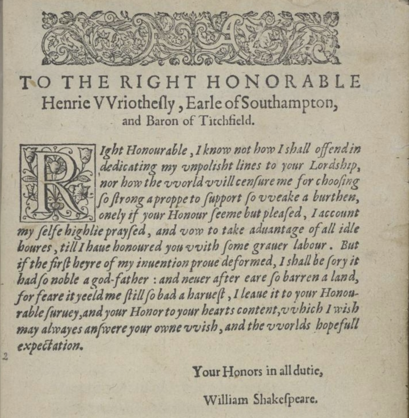Creator: William Shakespeare. Title: Venus and Adonis. Vilia miretur vulgus: mihi flauus Apollo. Pocula Castalia plena ministret aqua. Date: London : Imprinted by Richard Field, and are to be sold [by John Harrison] at the signe of the white Greyhound in Paules Church-yard, 1594. Repository: The British Library, London, UK.