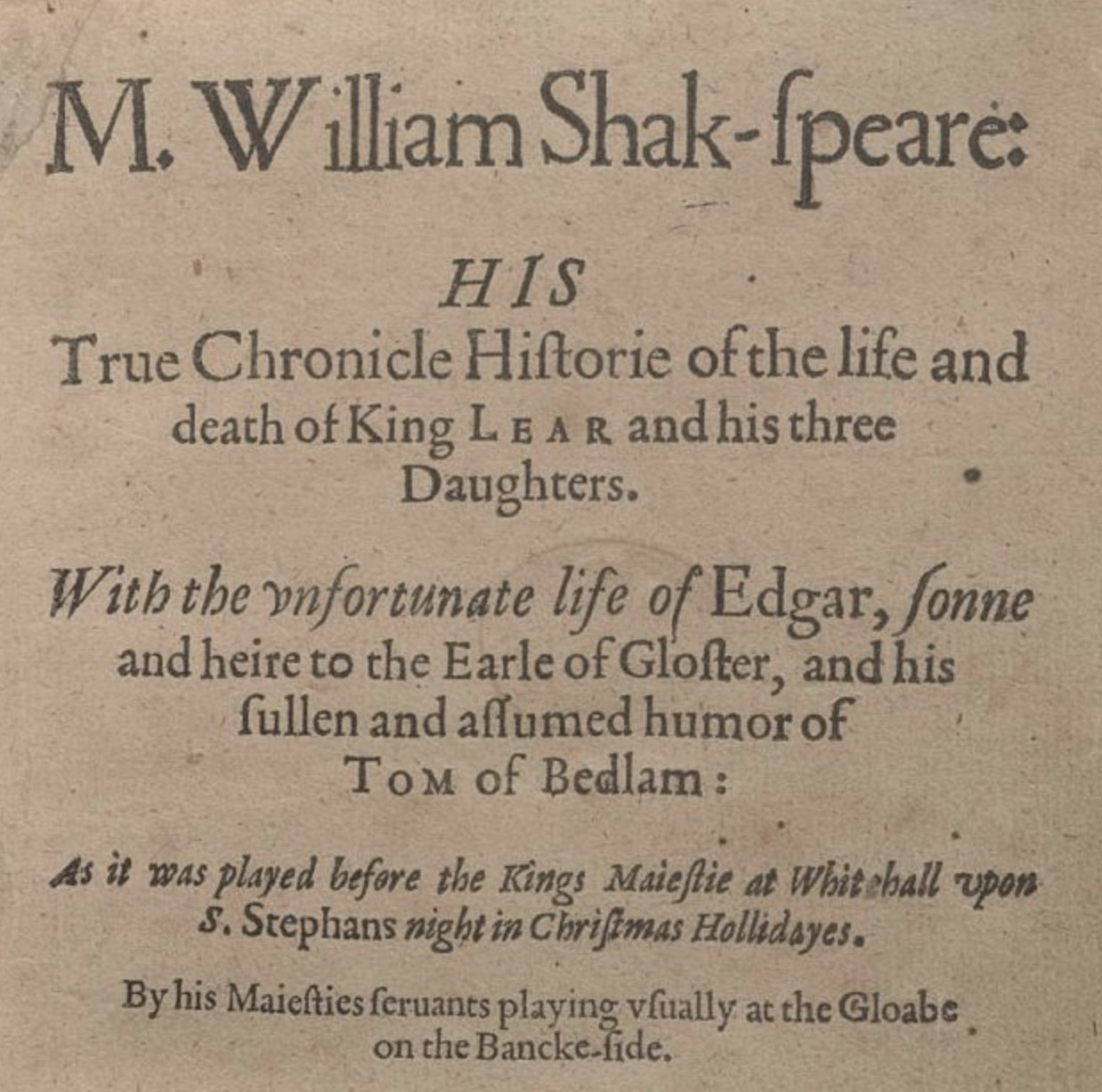 M. William Shak-speare: his True Chronicle Historie of the life and death of King Lear and his three Daughters. With the unfortunate life of Edgar, sonne and heire to the Earle of Gloster, and his sullen and assumed humor of Tom of Bedlam. As it was played before the Kings Maiestie at Whitehall vpon S. Stephans night in Christmas Hollidayes. By his Maiesties seruants playing usually at the Gloabe on the Banckeside. A “Gent.” in deed.