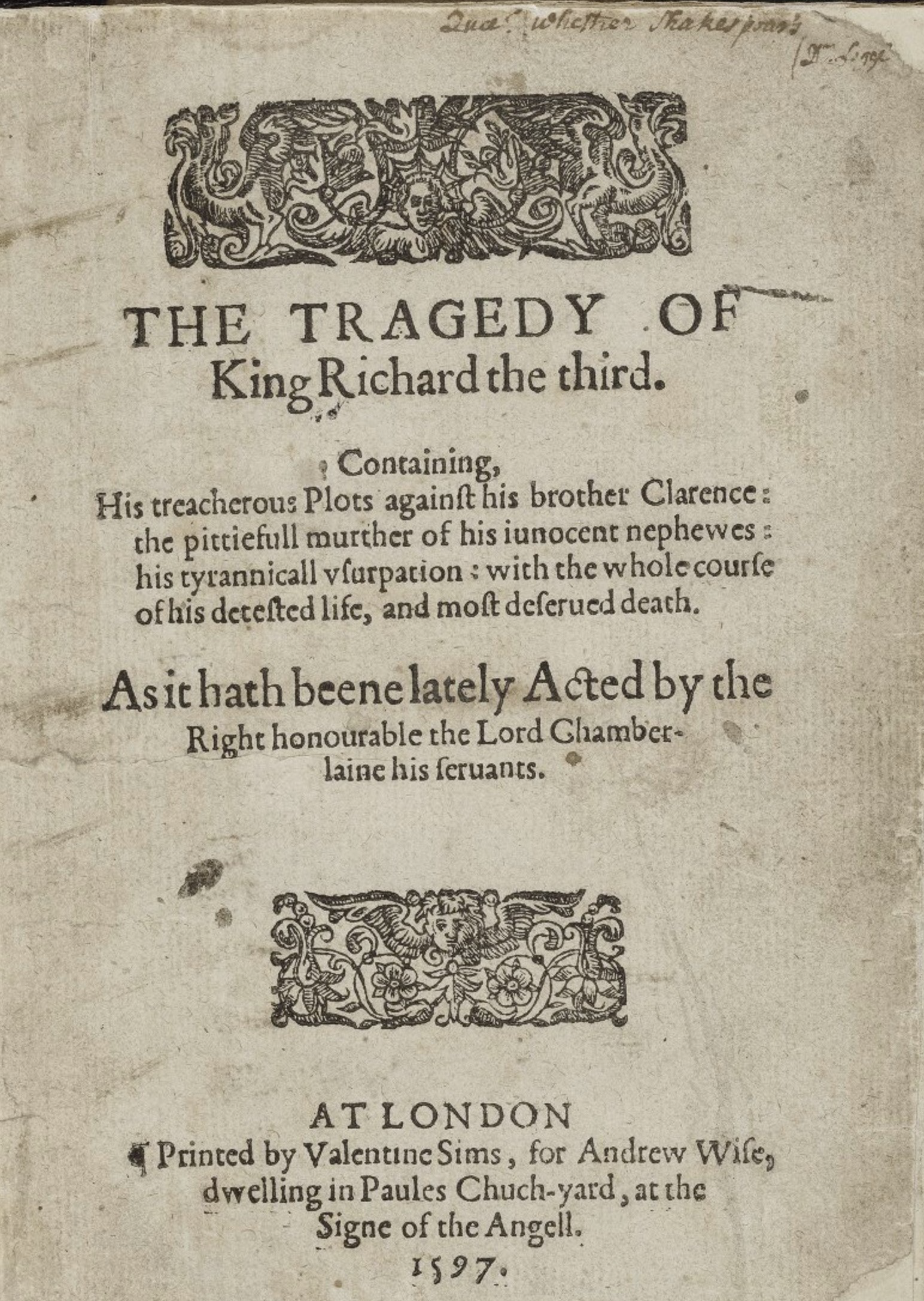 The publisher of the first edition was Andrew Wise, who registered his right to the title on October 20, 1597. In the late 1590s, no stationer was selling more Shakespeare than Wise, who acquired and published what would become the three most popular Shakespeare plays in print—Richard III, Henry IV, Part 1, and Richard II—all of which he published multiple times in a few years around the turn of the century. The title page of the first edition does not name an author, but when Wise published the second edition the next year, he added the name “William Shake-speare,” an indication that Wise thought attribution would help sell the play. Second edition title page. The copy shown above is held at the Folger Shakespeare Library, and is one of five known to exist according to The English Short Title Catalogue.