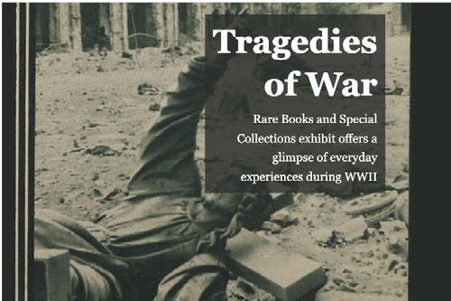 To show that reality, Schneider, Natasha Lyandres, Russian and East European studies librarian, and Jean McManus, Catholic studies librarian, have worked together to curate the latest Rare Books and Special Collections exhibit, Tragedies of War: Images of WWII in Print Visual Culture. The exhibit gives visitors a glimpse into the Second World War from the perspective of the everyday Europeans who lived alongside it.