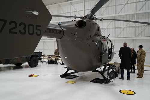 U.S. Army 1st Lt. Trevor Kleineschay, Headquarters and Headquarters Company, 1st Battalion, 112th Aviation Regiment, talks about the UH-72 Lakota mission during the Legislative Reception at the Army Aviation Support Facility, Bismarck, N.D., Dec. 3. (National Guard photo by Sgt. 1st Class Charles Highland, N.D. National Guard Public Affairs Office)