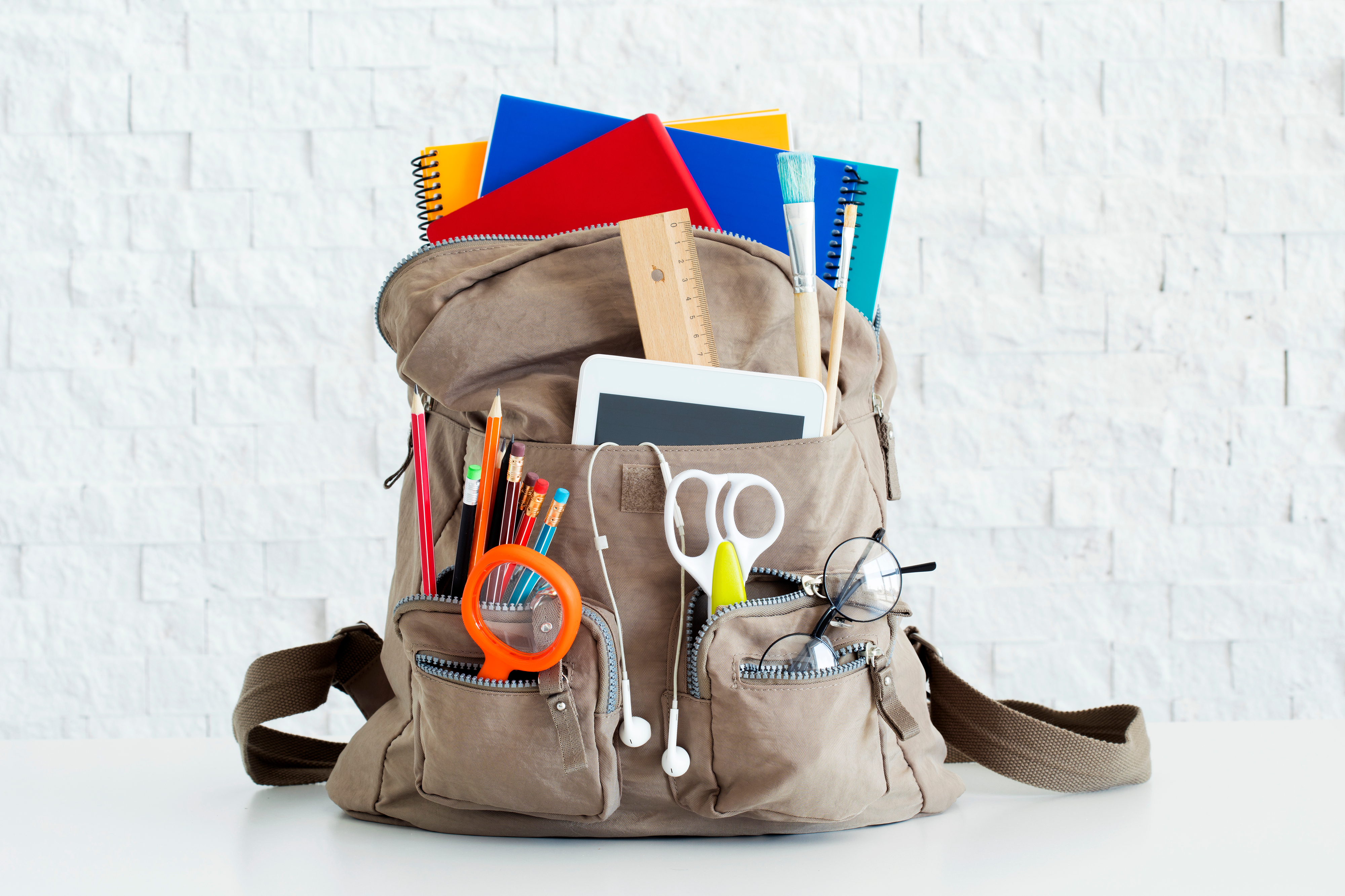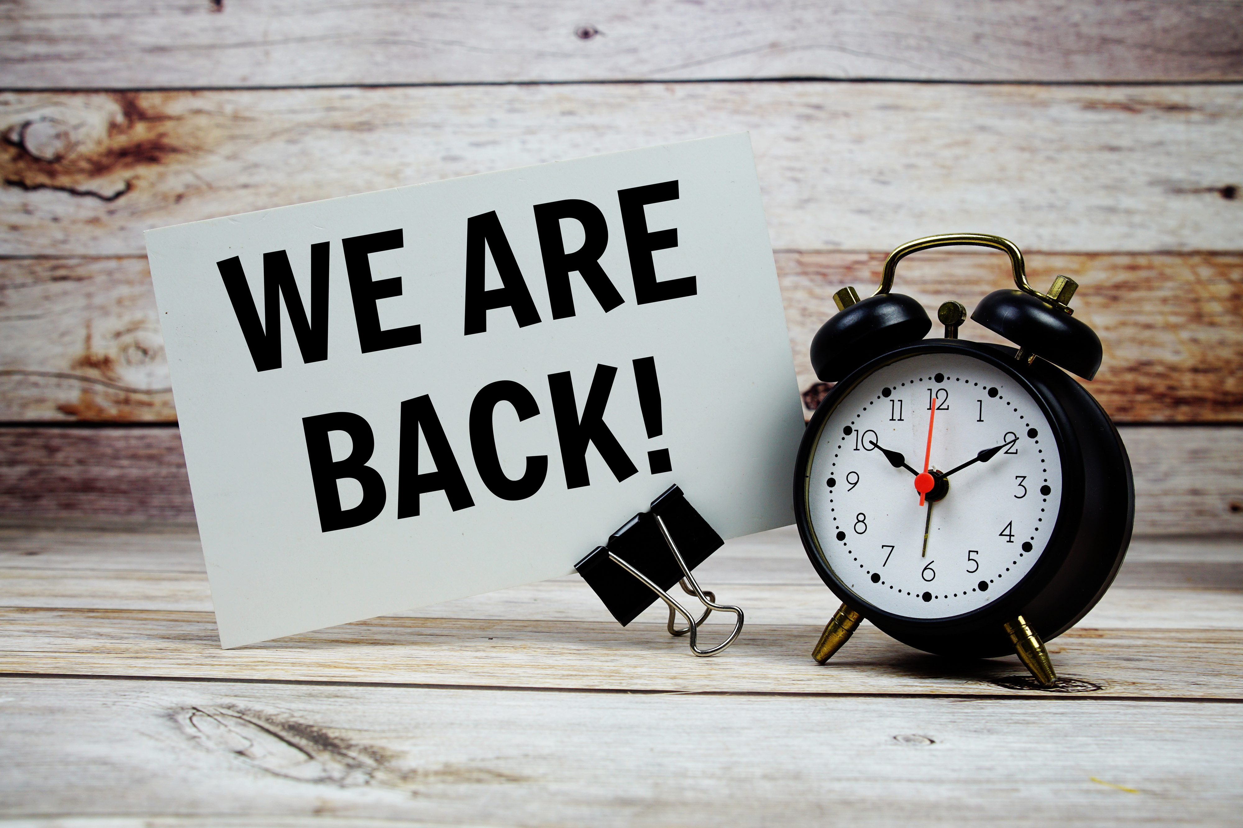 Created with images by may1985 - "We are Back text on paper card with alarm clock on wooden background" • sebra - "Backpack with school supplies" • suldev - "Positive cute robot pointing at a space. Copy space, ai generated" • BillionPhotos.com - "Campus." • Drazen - "Multiracial group of business seminar attendees communicating in conference hall." • magele-picture - "What can we do for you?"