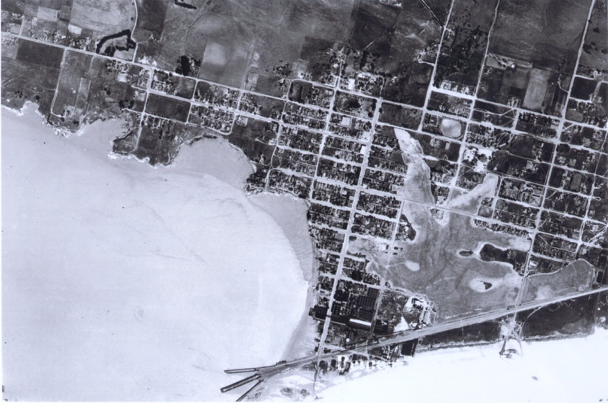 This is a 1931 aerial photo of Benicia showing the empty train ferry slips.