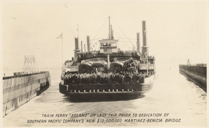 She said that "'Progress,' the ogre of civilization, that day terminated the magnificent performance of the “Queen” of all train ferries, the ”Wonder of her Age,” Solano. Benicia’s participation in the “Golden Years of American Railroading” ceased. The lovely name of our town would never again grace the North Western and Cross-Country timetables. An era had ended!" (https://beniciahistoricalsociety.org/railroad-heritage/)