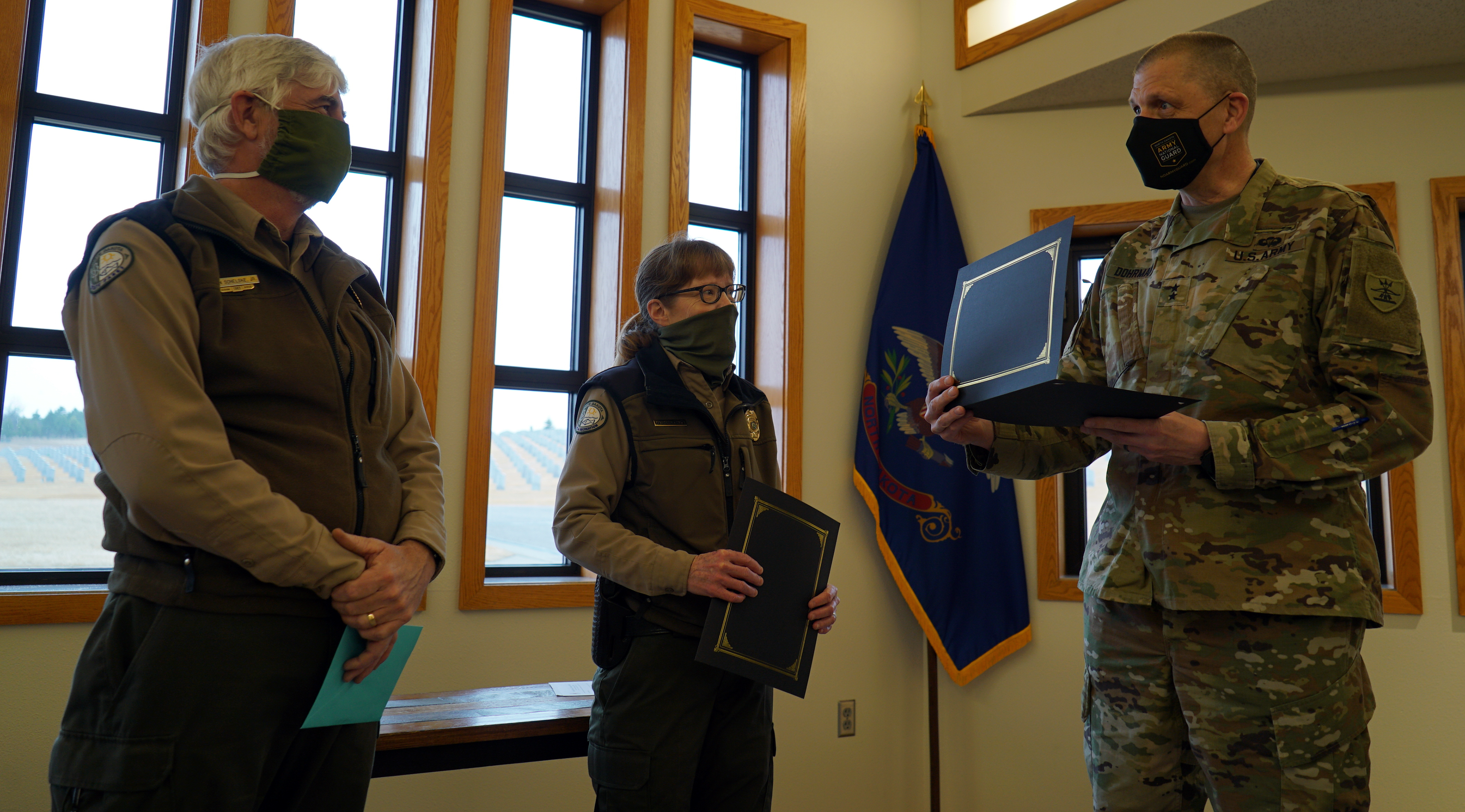 Maj. Gen. Al Dohrmann, N.D. adjutant general, prepares to hand Park Ranger Dan Schelske, a retirement appreciation certificate as Maureen Trnka looks on, at the N.D. Veterans Cemetery, Mandan, N.D., March 17, 2021.