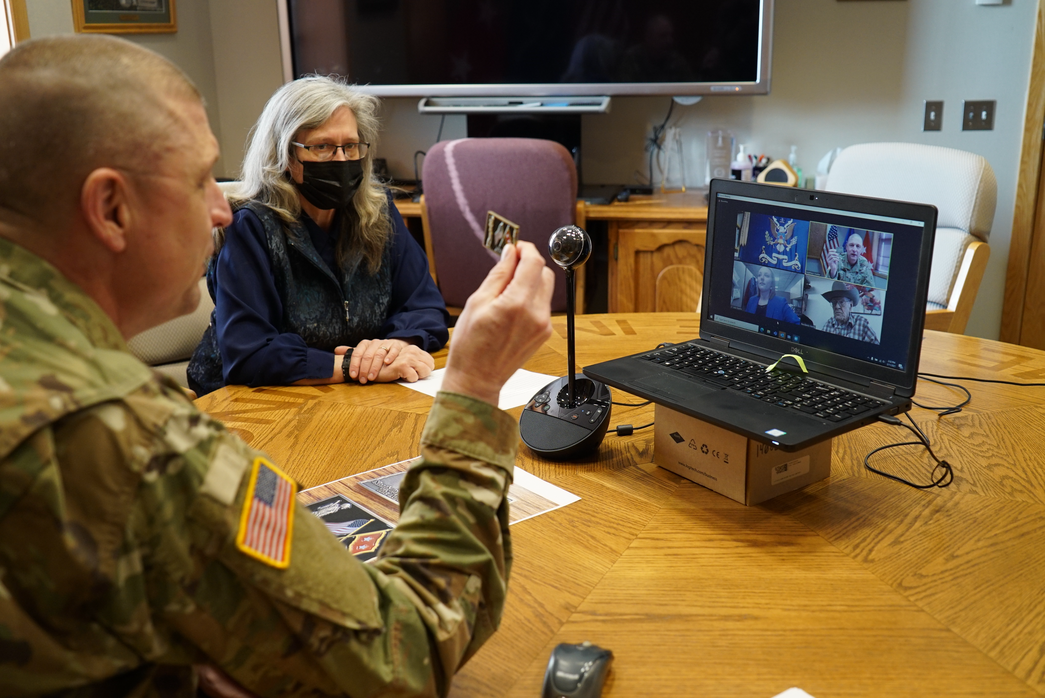 Also participating in the Zoom interview with Maj Gen Dohrmann adjutant general, left, was retired Lt. Col. Shirley J. Olgeirson, N.D. National Guard historian. (U.S. National Guard photo by Sgt. 1st Class Charles Highland, N.D. National Guard Public Affairs)