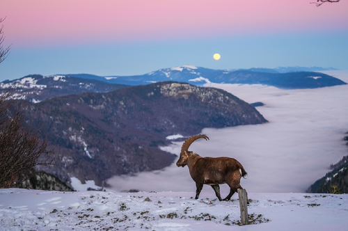 - A full moon rising, sunset colors, a sea of clouds, a wild male Alpine Ibex and snow. An entry in Wiki Loves Switzerland 2022. Photo by Giles Laurent - own work, CC BY-SA 4.0.
