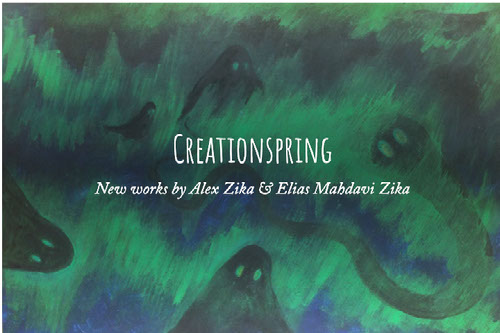 The paintings in the exhibition Creationspring of Alex Zika and Elias Mahdavi Zika conjure imagined topographies and spaces of interiority - some readable as caves and rooms, where ghosts, books, family, artistic gestures and fragments of language drift through layers of memory and matter.