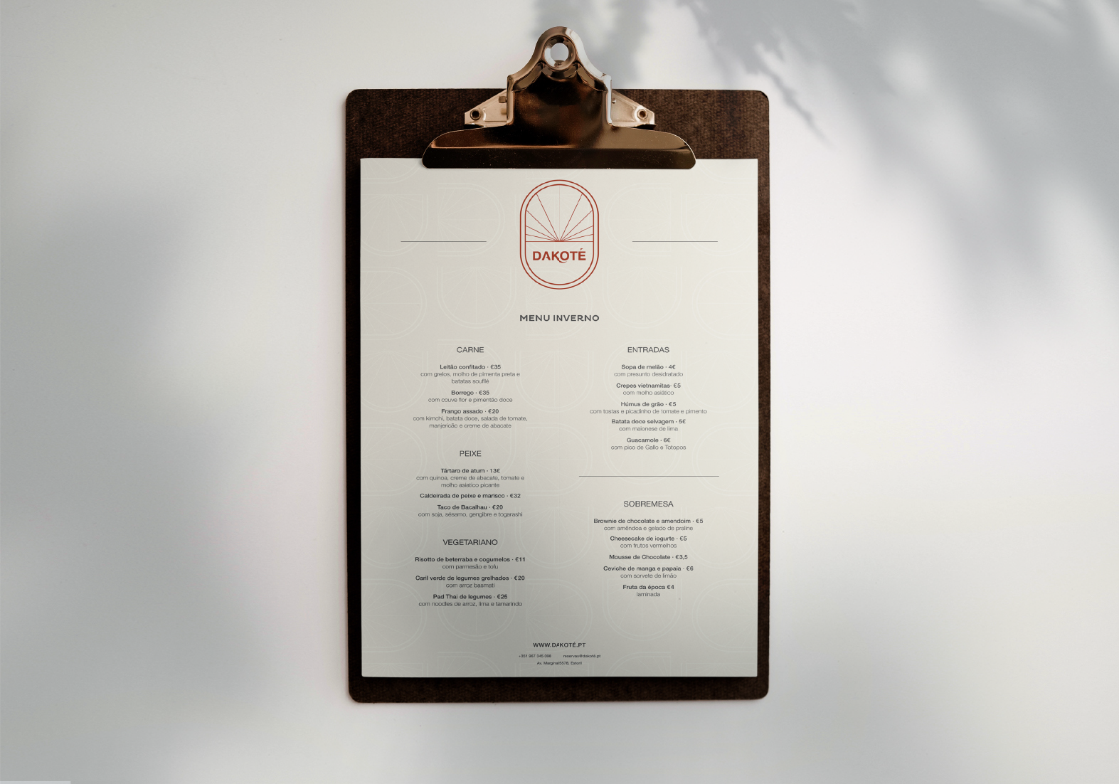 Projecto de naming, logo design, brand identity e diversas aplicações para lançamento da marca Dakoté. Um restaurante com inspiração — comida e arquitectura — em toda a riqueza que Portugal oferece, desde os seus variados sabores, às suas cores e luz.