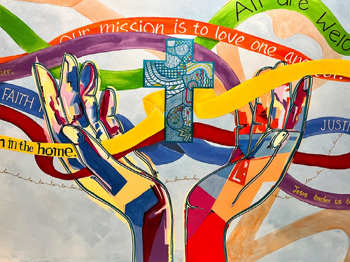 The photo above shows a portion of the mural on the third floor of the Center of Hope. This mural was inspired by a panel of youth and painted by Mural Ninjas.