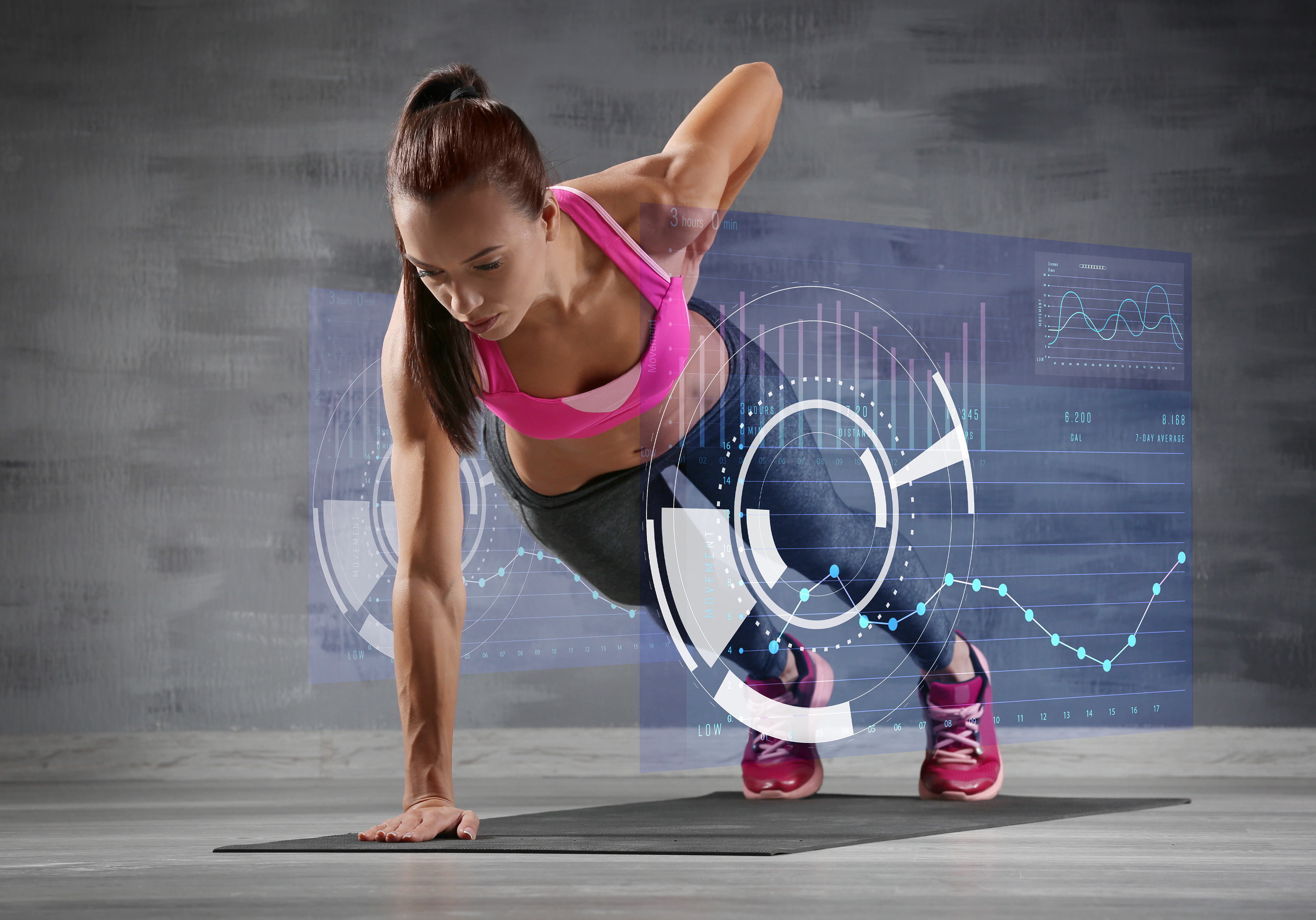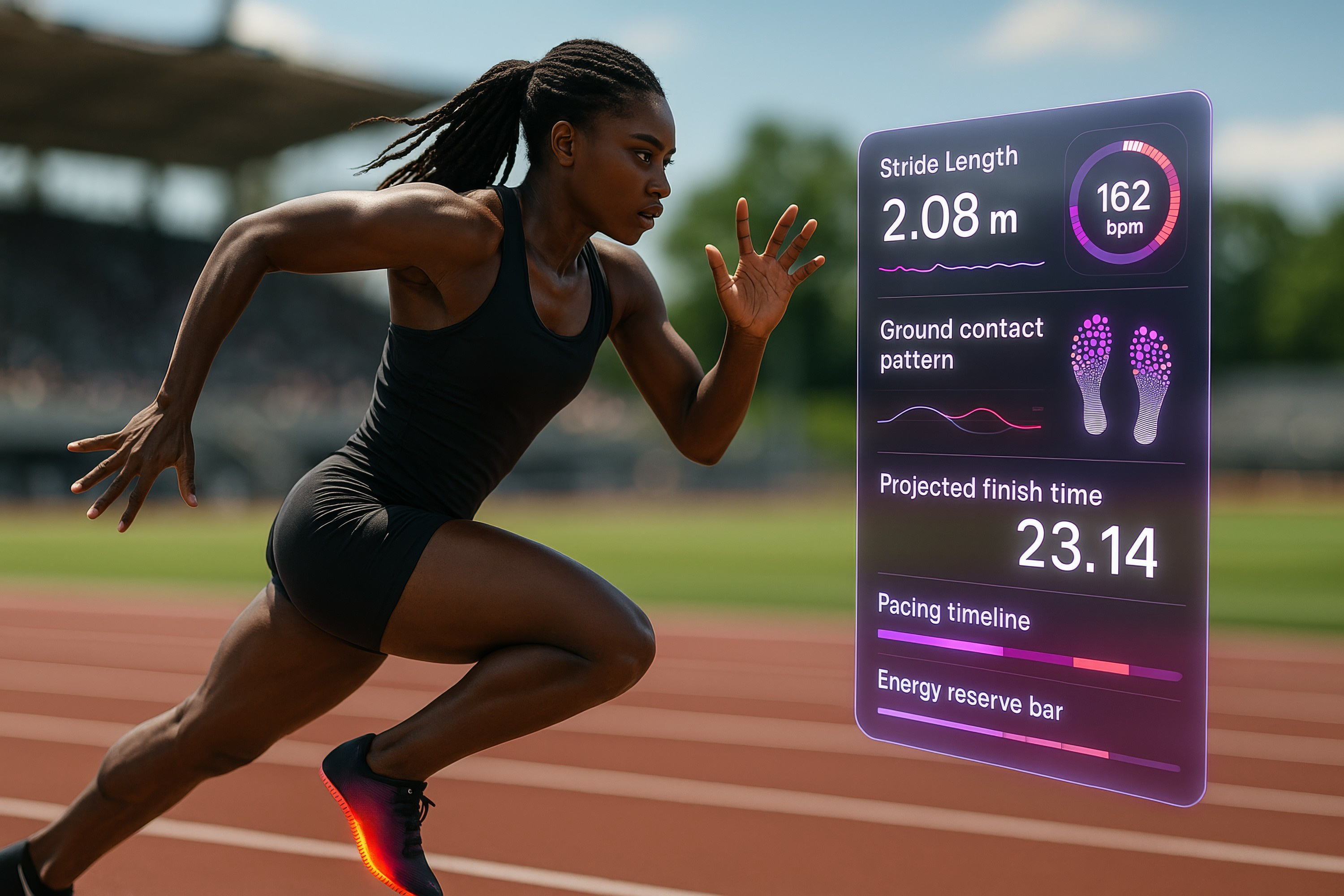 Cré�� à partir d’images de : Jacob Lund - "Sprinter running on track" • Andrey Popov - "Various Sport Equipments On Grass" • C Malambo/peopleimages.com - "Hologram, shoes and sports for fitness, run and speed for health tracking outdoor. Future, sneakers and graphics for workout, exercise and balance for routine, training for marathon and wellness." • kromkrathog - "Fitness tech healthcare wellness innovation concept with wearing watchband smartwatch" • Vadym - "Modern shoe manufacturing with 3D printer. White, yellow athletic sneaker on the production line. Innovative tech in footwear design, production. New tech for sport shoes." • LaVika - "Futuristic digital race scene with three young male runners" • Africa Studio - "Sporty young woman making exercise on gray background" • top images - "African female athlete sprinting on track with data overlay in outdoor stadium"