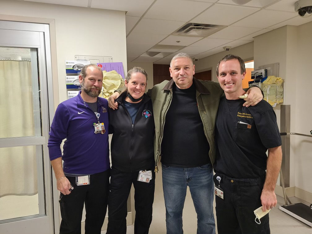 His next memory is having a nitroglycerin pill under his tongue and sitting up on the observation table and saying, “I’m feeling better,” until he suddenly fell backward on the exam room table. What happened next was far from a sign of feeling better–Jennifer, described how he began having convulsions and his heart completely stopped. The Bedford ED team immediately began administering CPR and attempting to resuscitate John.