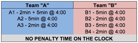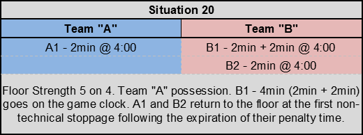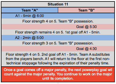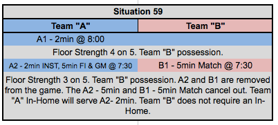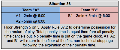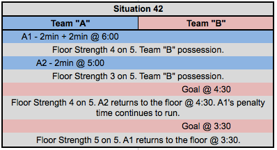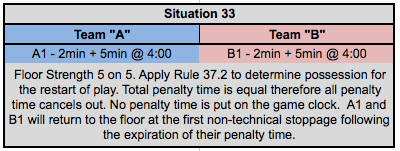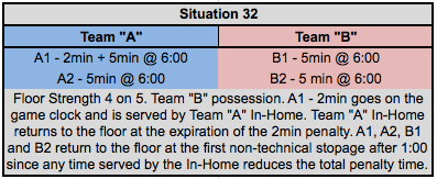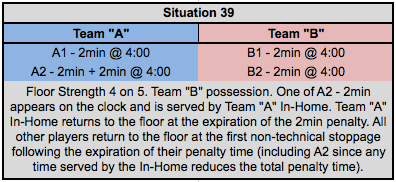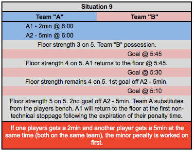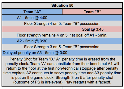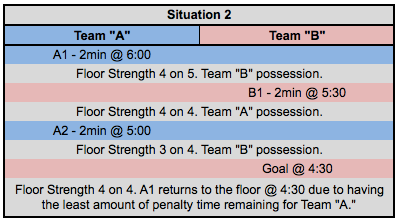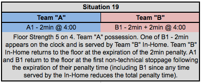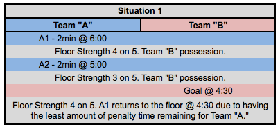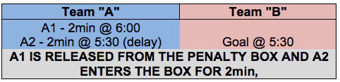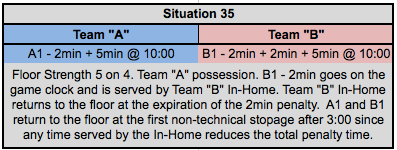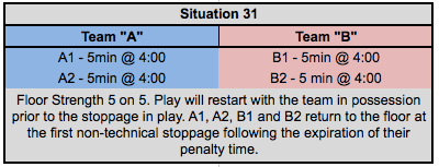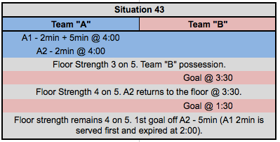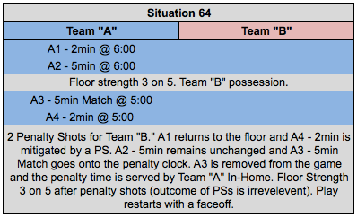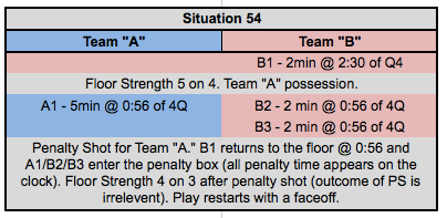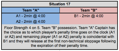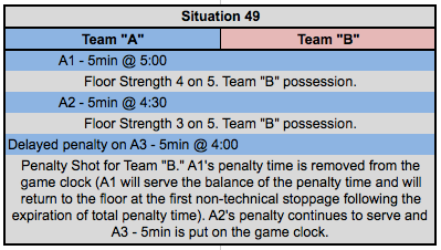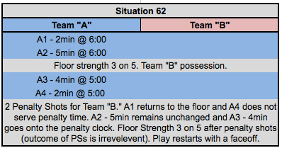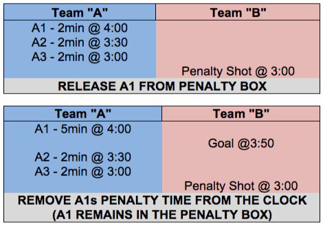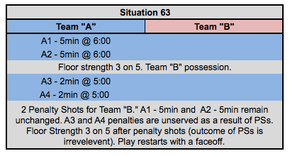 43.1 TWO MEN DOWN AND ADDITIONAL PENALTY TO THIRD PLAYER – If a team is already two (2) men down from full strength and is assessed an additional time penalty to a third player, the non-offending team shall be awarded a penalty shot. Regardless of the outcome of the penalty shot, the floor strength will remain as it was prior to the penalty shot. The team that received the third time penalty will begin play after the penalty shot, two men down from full strength. We never stack penalties on the time clock.