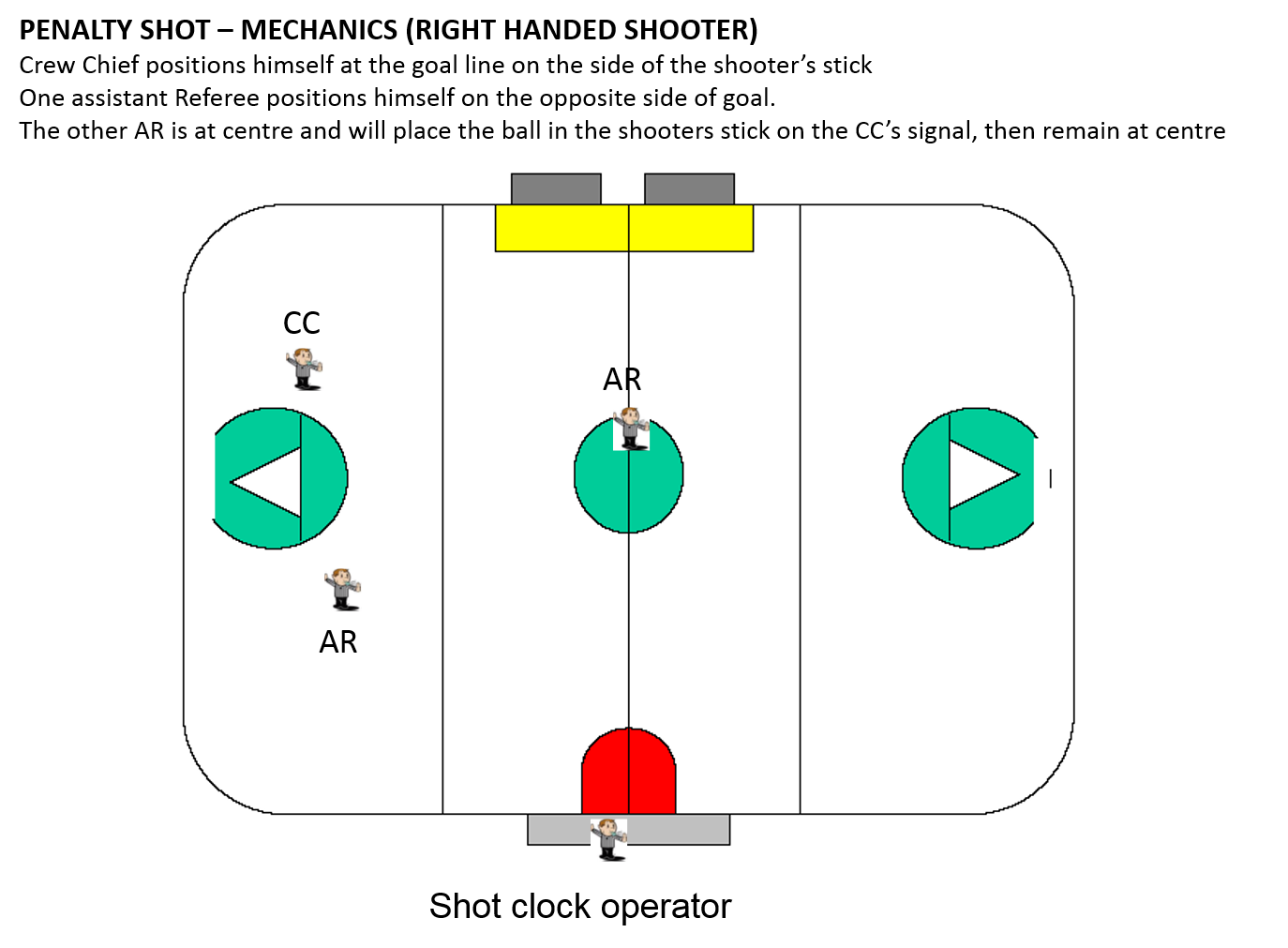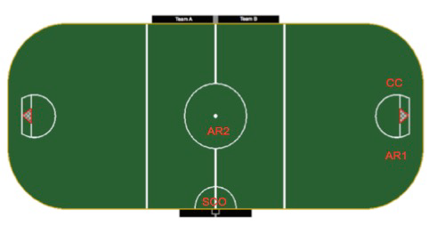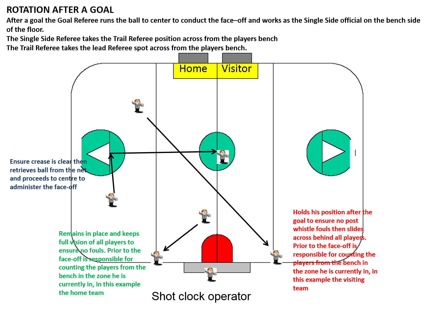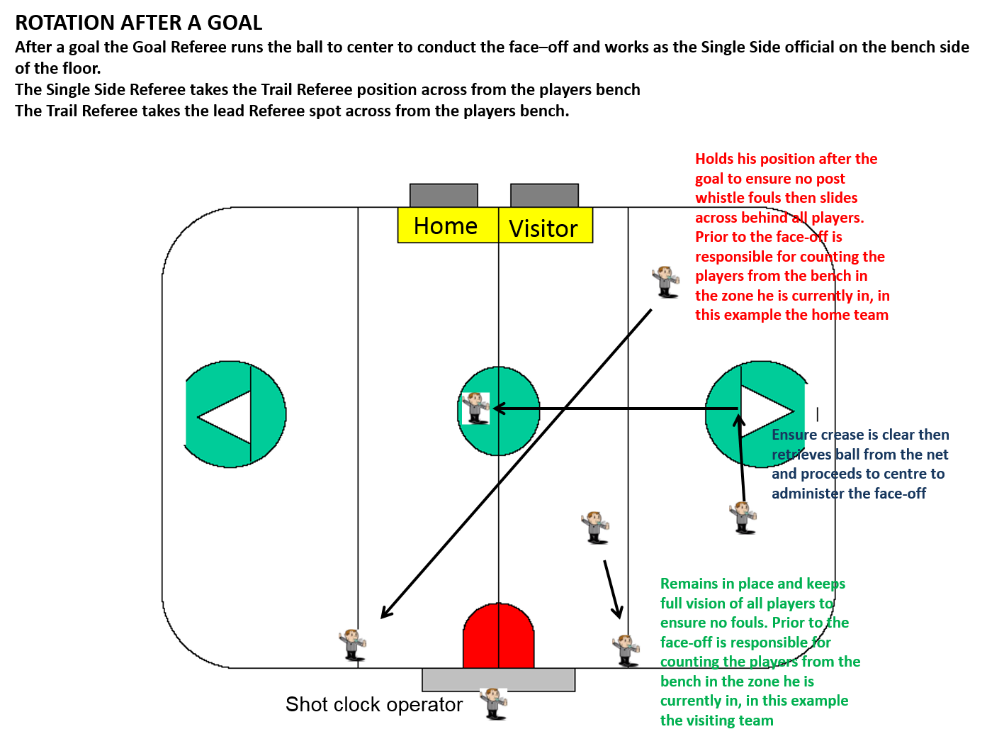 4) The Crew Chief positions himself at the goal line on the side of the shooter’s stick and positions one the Assistant Referees on the opposite side of goal. The other Assistant Referee will be at the centre face-off circle.