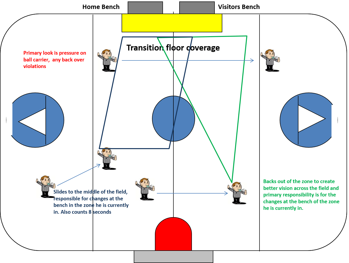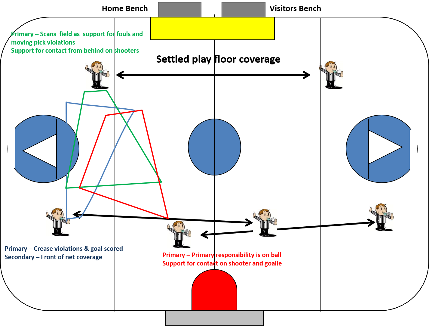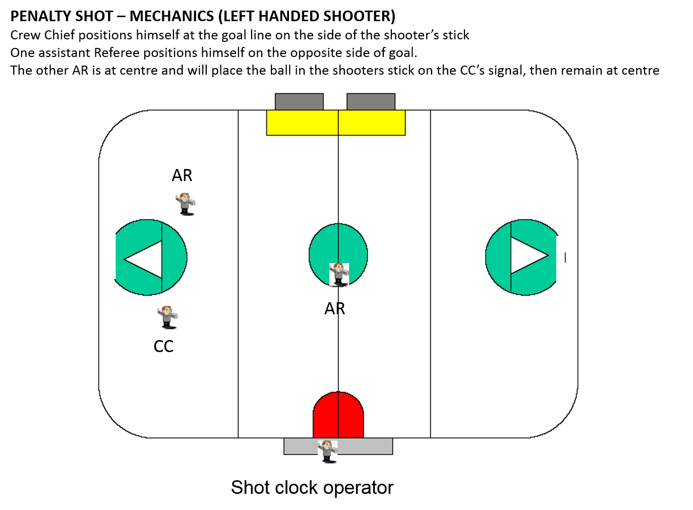 4) The Crew Chief positions himself at the goal line on the side of the shooter’s stick and positions one the Assistant Referees on the opposite side of goal. The other Assistant Referee will be at the centre face-off circle.