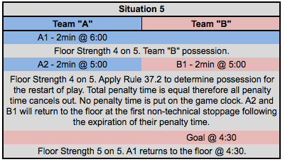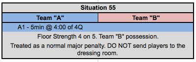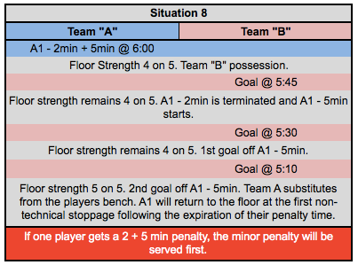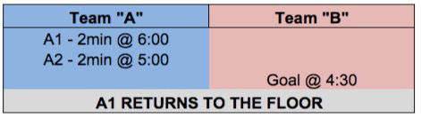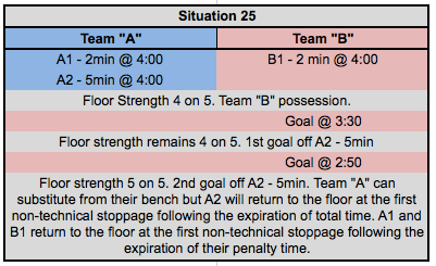Situation 2: the Blue Goalkeeper is removed and the crew contacts and signals to each other that the Goalkeeper is removed. The attacking team in Blue now has 6 Players on the floor. The Blue Team loses the ball and the Red team picks up the ball at and is transitioning towards the empty net when the Blue Goalkeeper, or another Blue Player, leaves the players bench “early.” However, the Red Player does not have an unobstructed path to the empty net (there is a Blue player in front of the Red ball carrier at the time). In this situation there will be minor penalty for illegal substitution to the Red team.