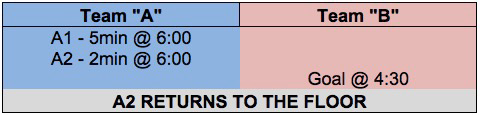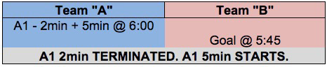 Result: Since sufficient and timely replays were shown of the Team B goal, if Team A also wishes to challenge the Team B goal, Team A must throw a towel or otherwise notify an official within 35 seconds of the Team B goal being scored. If the ruling on the Team A shot is overturned, Team A will not be charged a second challenge for initially challenging the Team B goal.