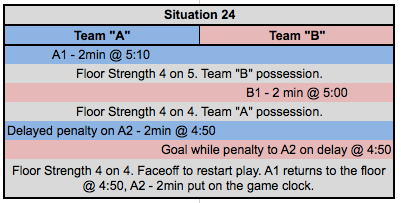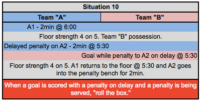 Rule 28 Mechanic: should a goal be scored by the offending team when the injured player is on the floor illegally it shall not count provided the infraction was assessed by the official prior to the re-start of play. The Crew Chief/Assistant Referees must either see the infraction during dynamic play or if missed during dynamic play shall confirm that the infraction occurred with the Crew Chief/Assistant Referee or Shot Clock Official if necessary prior to the next faceoff restart.