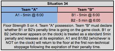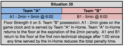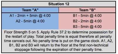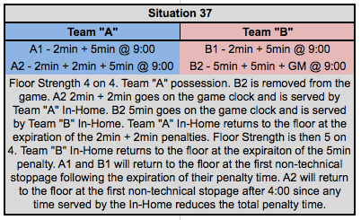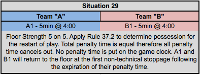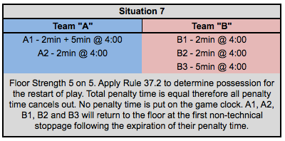 Situation 1: If, while a player is exiting the floor, he is involved in incidental contact with an opponent entering the floor, and such incidental contact directly results in the exiting player's team having too many men on the floor, then an Illegal Substitution penalty should not be assessed. Per Rule 56.3, the player exiting the floor has the right of way from the floor to the bench. If a substitution involving the exiting player is imminent, the exiting player's team should not be penalized in this situation.