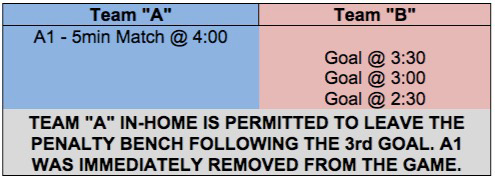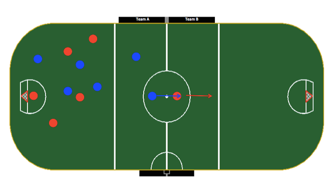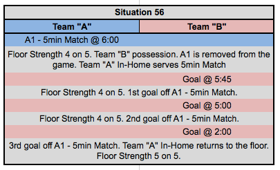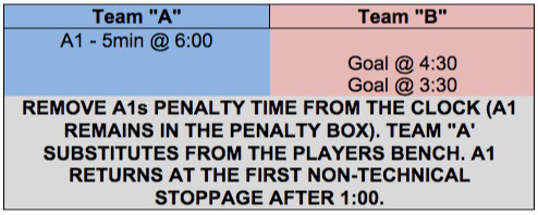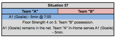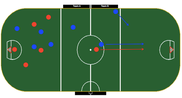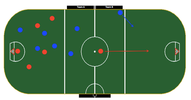 Situation 1: the Blue Goalkeeper is removed and the crew contacts and signals to each other that the Goalkeeper is removed. The attacking team in Blue now has 6 Players on the floor. The Blue Team loses the ball and the Red team picks up the ball at center and has an unobstructed path to the empty net. The Blue Goalkeeper, or another Blue Player, leaves the players bench “early” and the Red Player is interfered by either: the Goalkeeper being in the net, the Goalkeeper stopping the ball, a shot which goes wide of the net as a result of the Goalkeeper being in the net, a shot which hits the goal post as a result of the Goalkeeper being in the net or the pathway to the net is obstructed by the defender illegally on the floor. In this situation there will be an awarded goal to the Red team.