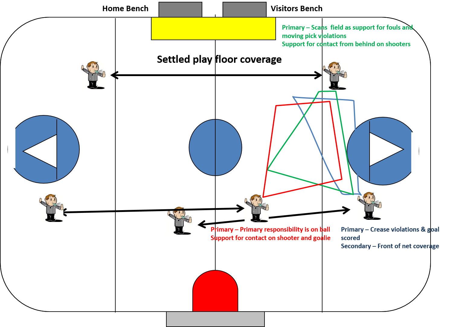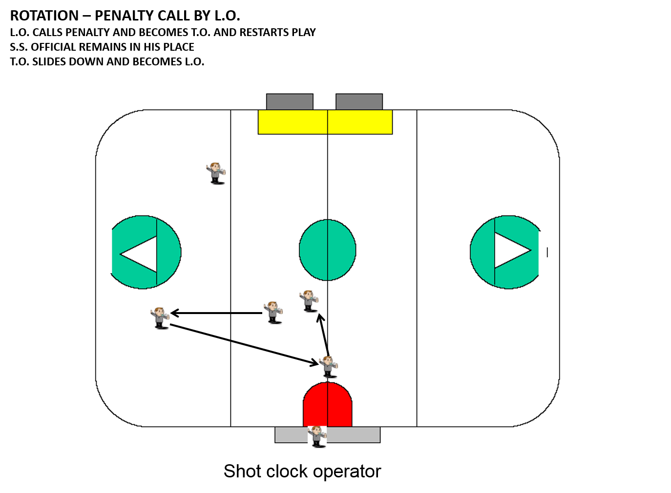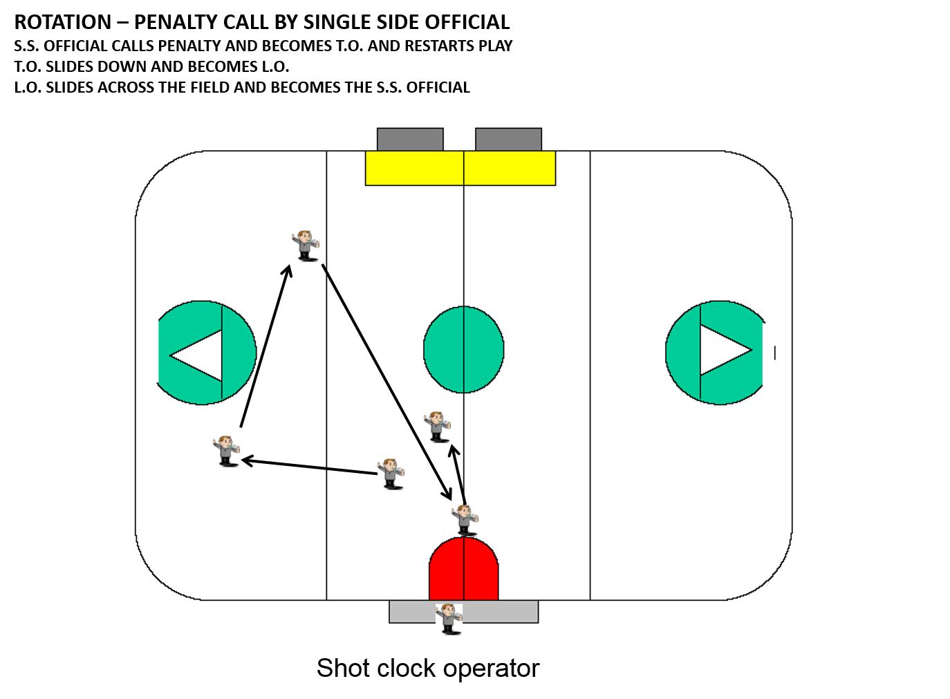 Single Side Official (SSO): moves to his position on the far restraining line while monitoring the players. This official should time his movement to coincide with post goal movement of the players (i.e. changes, etc).