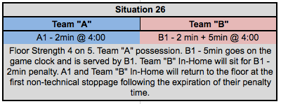 Any player that violates Rule 26.1 by not complying with wearing the proper leggings per the Rule shall leave the floor after being instructed by the official. If the player fails to leave the floor after being instructed to do so or returns to the floor still in violation of Rule 26.1, a minor penalty shall be assessed per Rule 90.1.