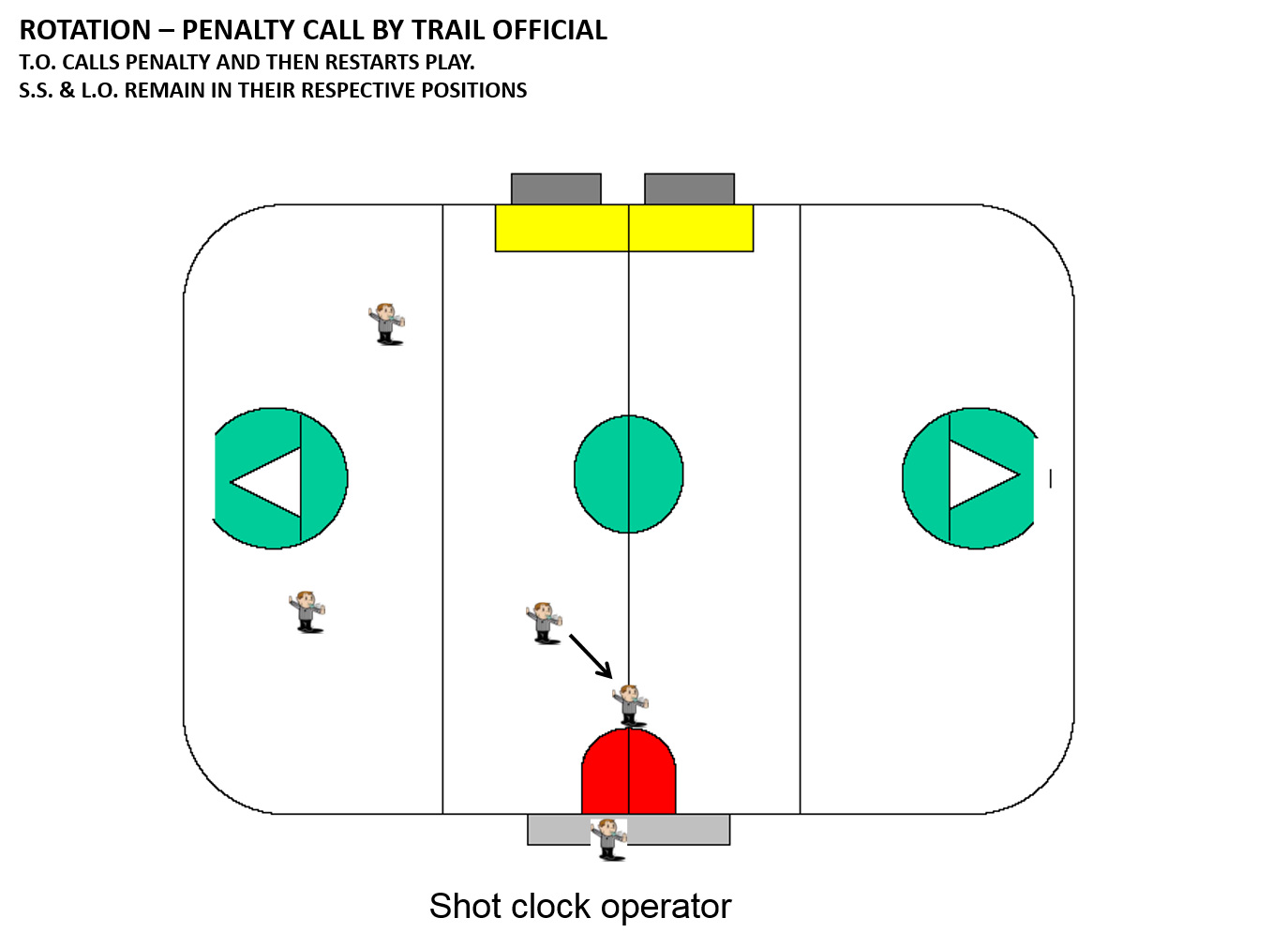 Single Side Official & Trail Official - Assist in determining the sequence of the game horn sounding, and goal scored as per Rule 54. Watch designated bench for line change and the goalie being pulled. Secondary: Determine goal scored as per Rule 54 and goal not counted as per Rule 55.