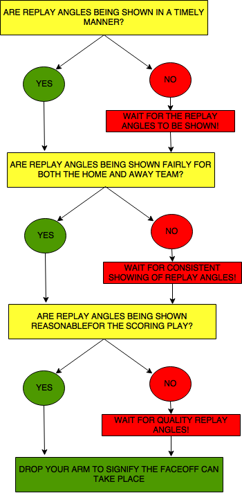 Mechanic: Faceoff Official puts himself in position to see the SCO's hand and the Jumbotron Official's hand. Faceoff Official shall determine which hand goes down first and will be the primary official to provide this information to the Crew Chief when necessary. Faceoff Official shall focus on viewing the SCO's hand and then upon the hand going down will turn to the Jumbotron official to see the status of his hand.