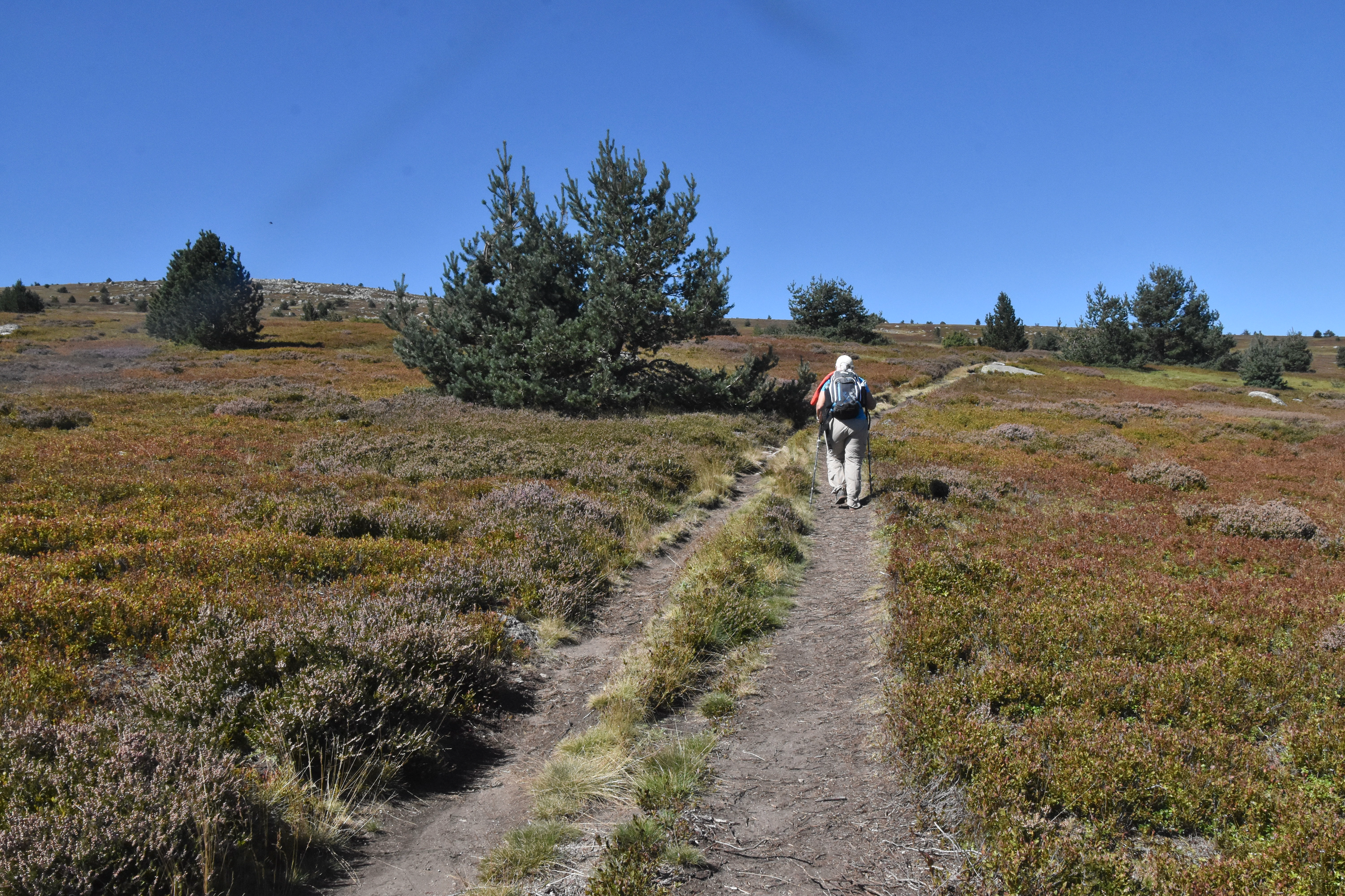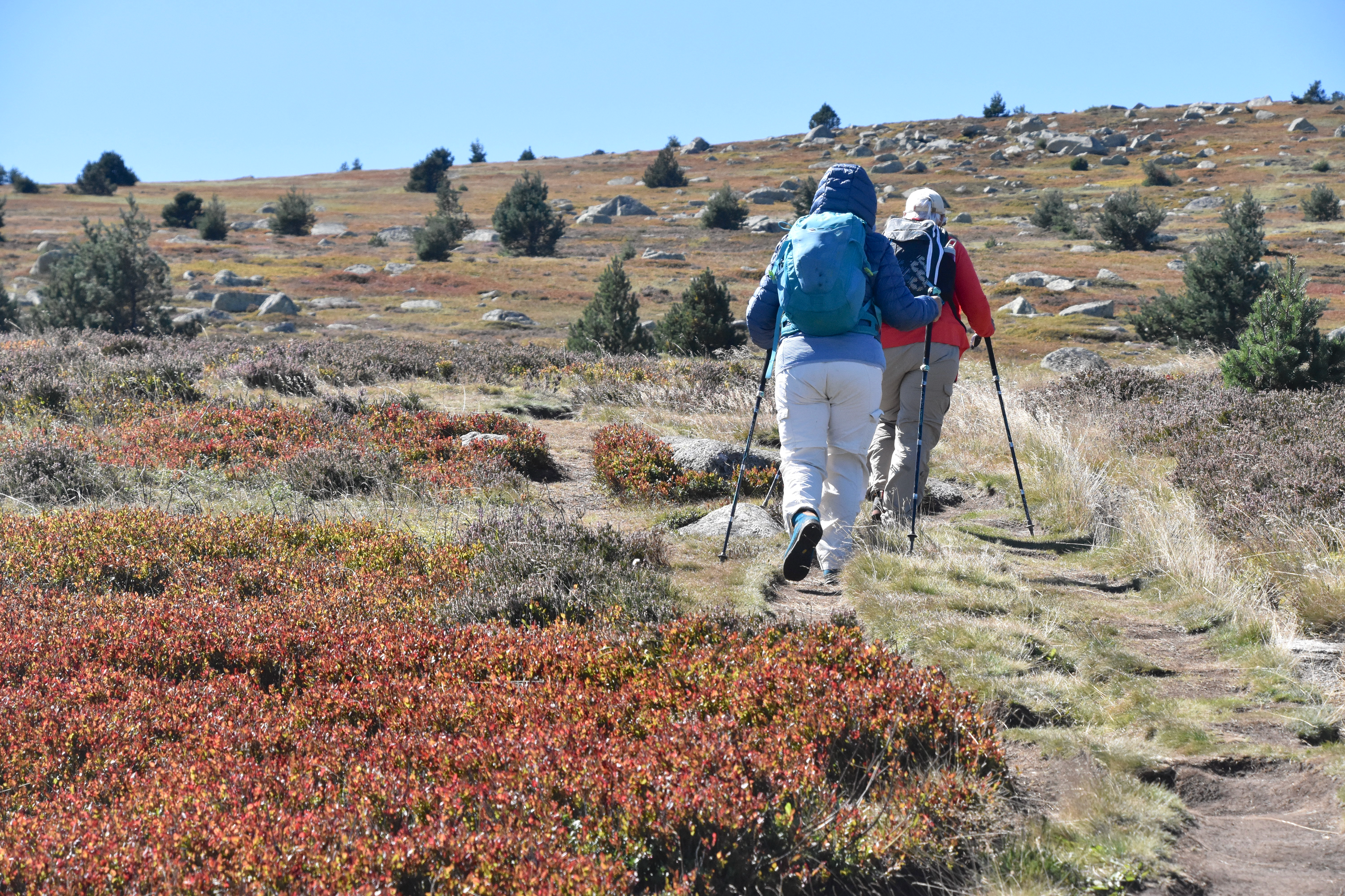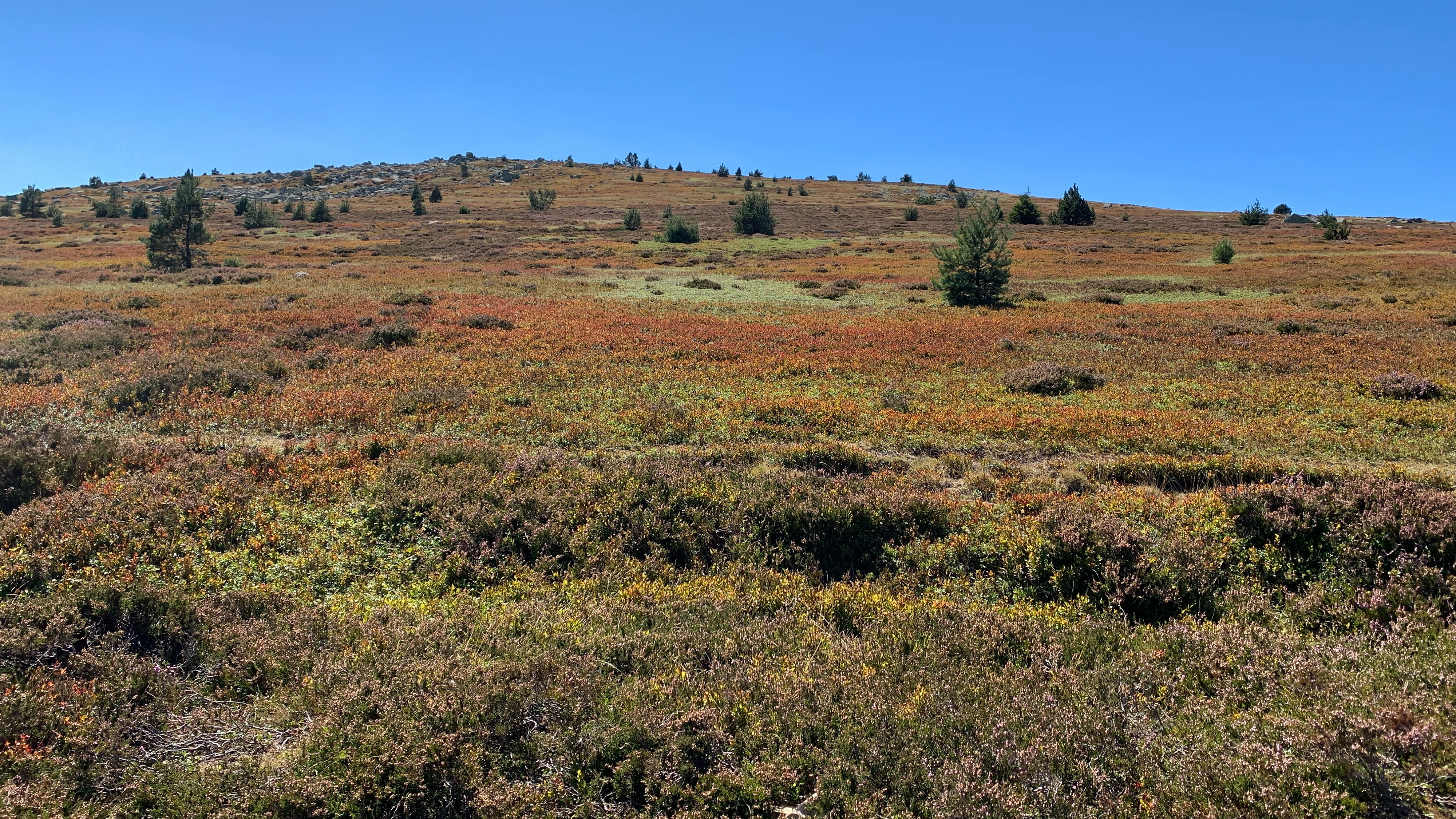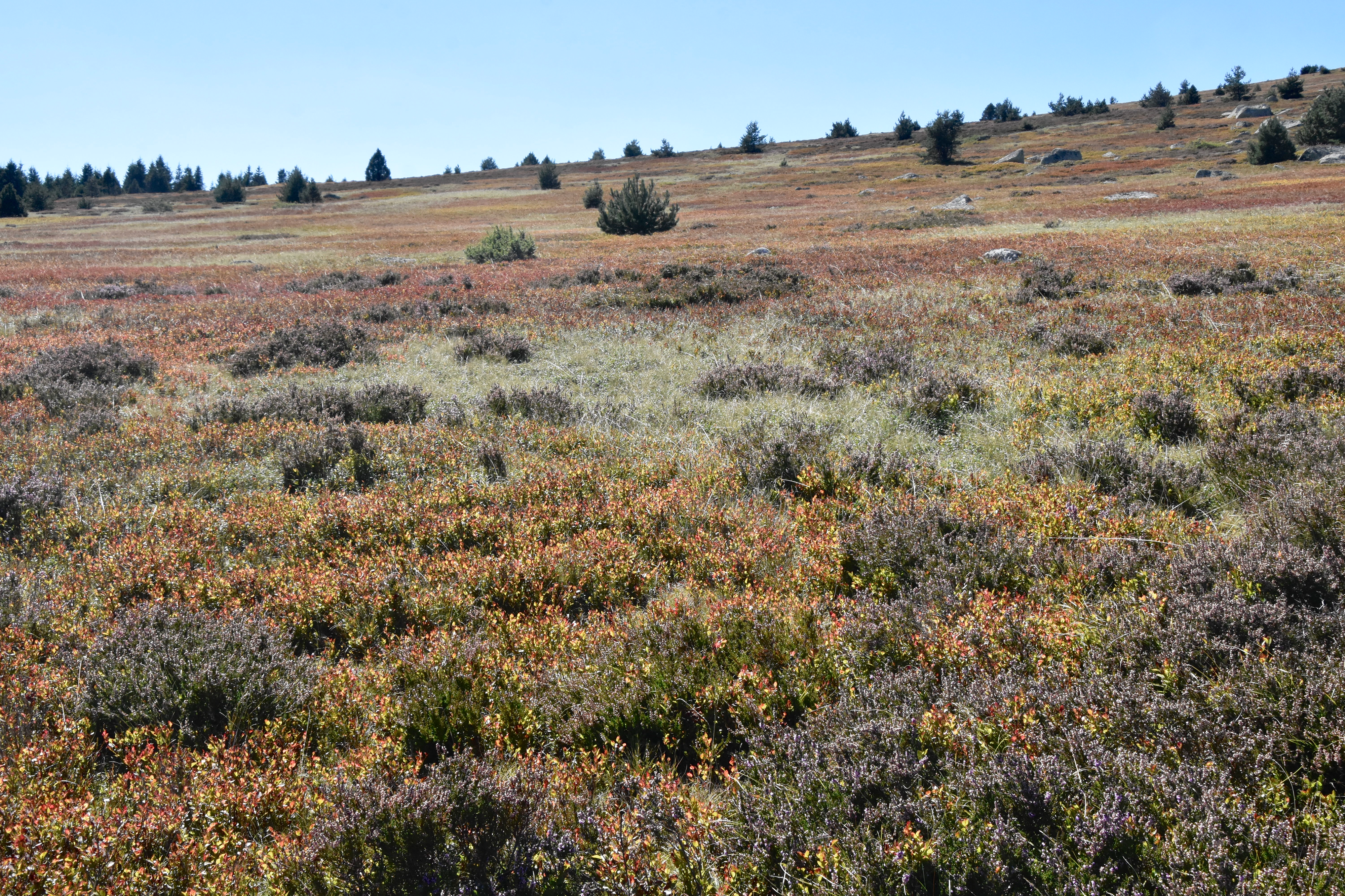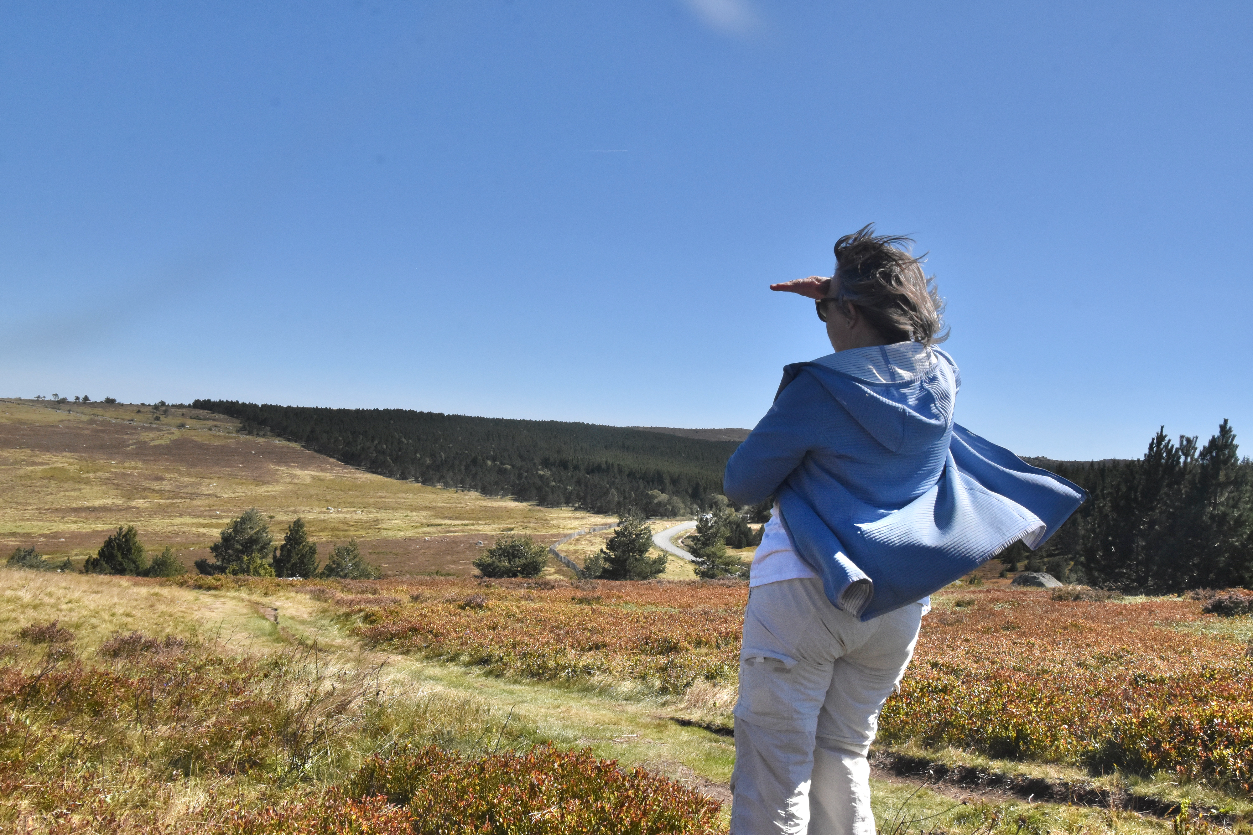 Aujourd’hui, en passant au col de Finiels, nous avons atteint le point culminant de la semaine mais aussi celui du mont Lozère chaîne montagneuse s'étendant de Florac à Villefort, dans le sens est-ouest, et du Bleymard au Pont-de-Monvert dans le sens nord-sud. Le Mistral nous bouscule, il faut être bien attentives pour rester droites. Rhododendrons au feuillage automnal, ciel bleu, la montée est rude à lutter contre ces éléments que sont la pente et le vent.