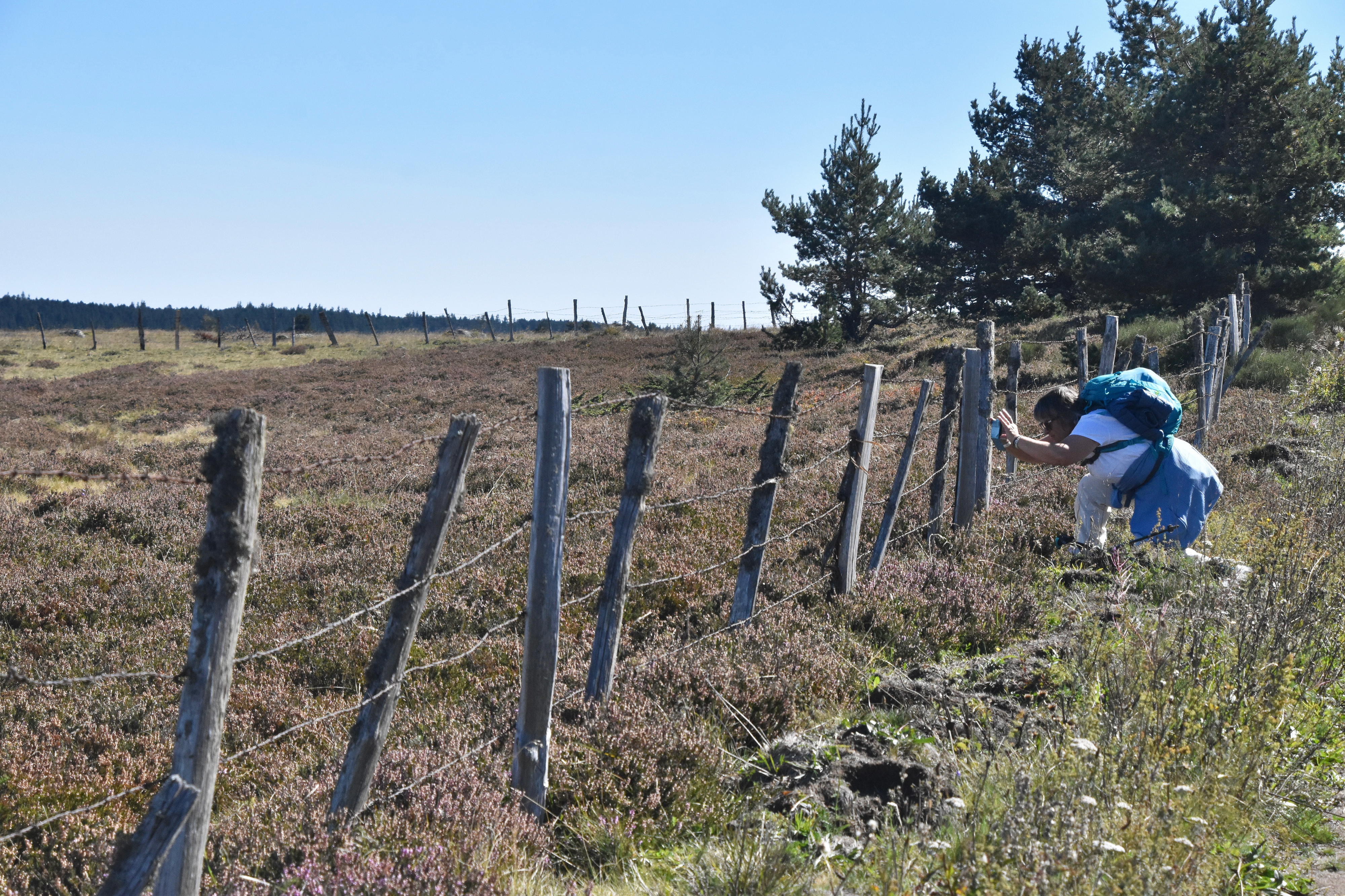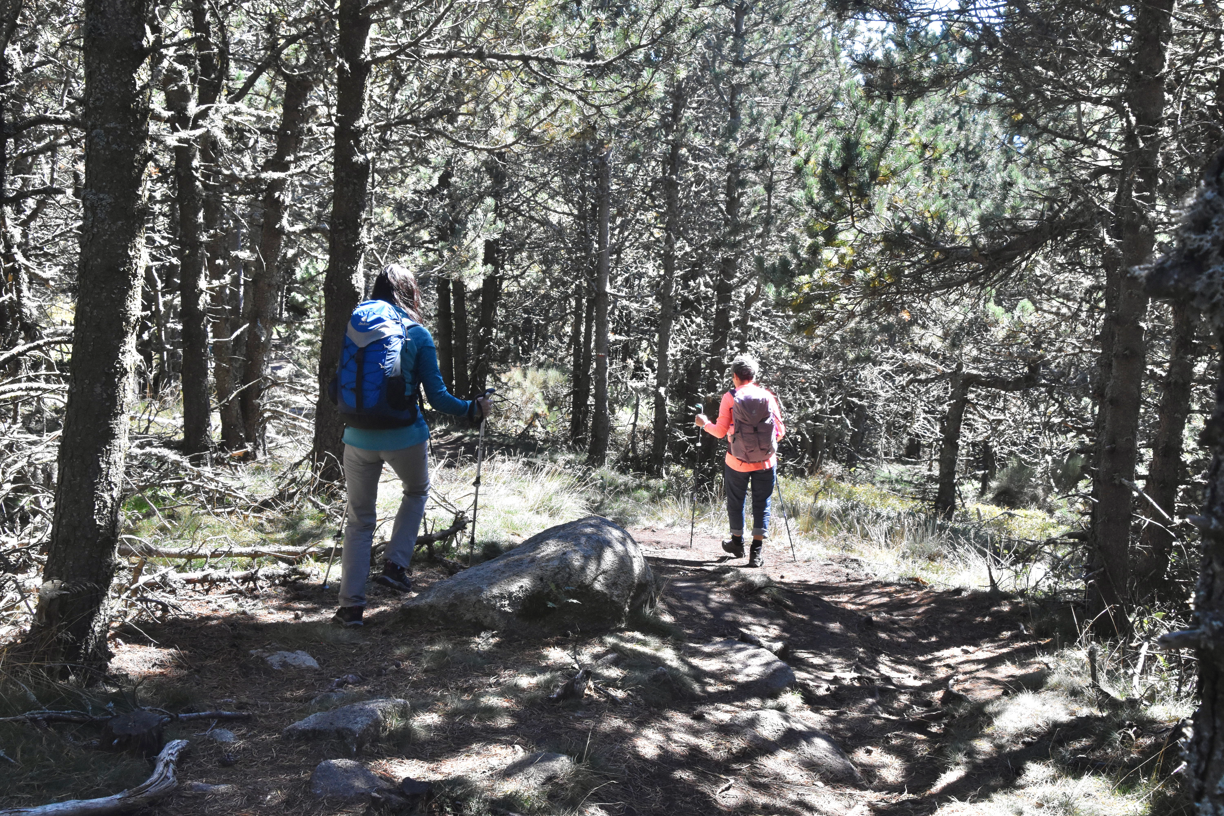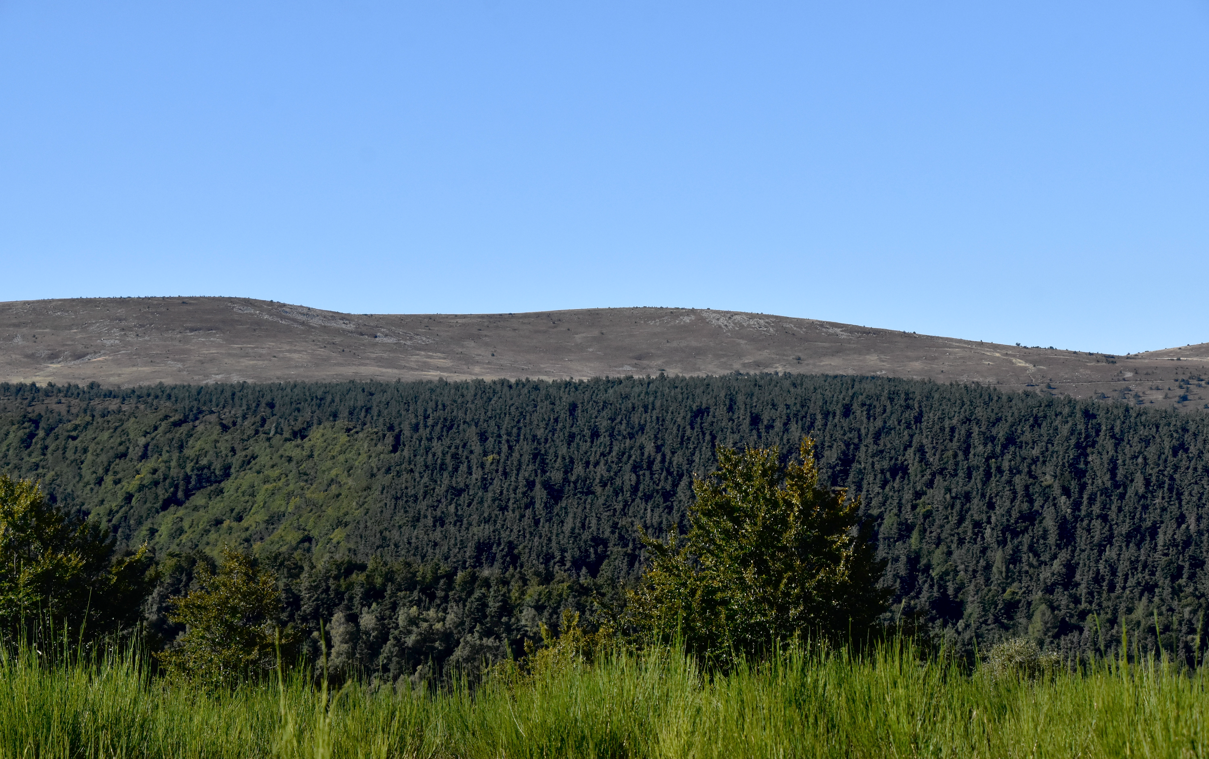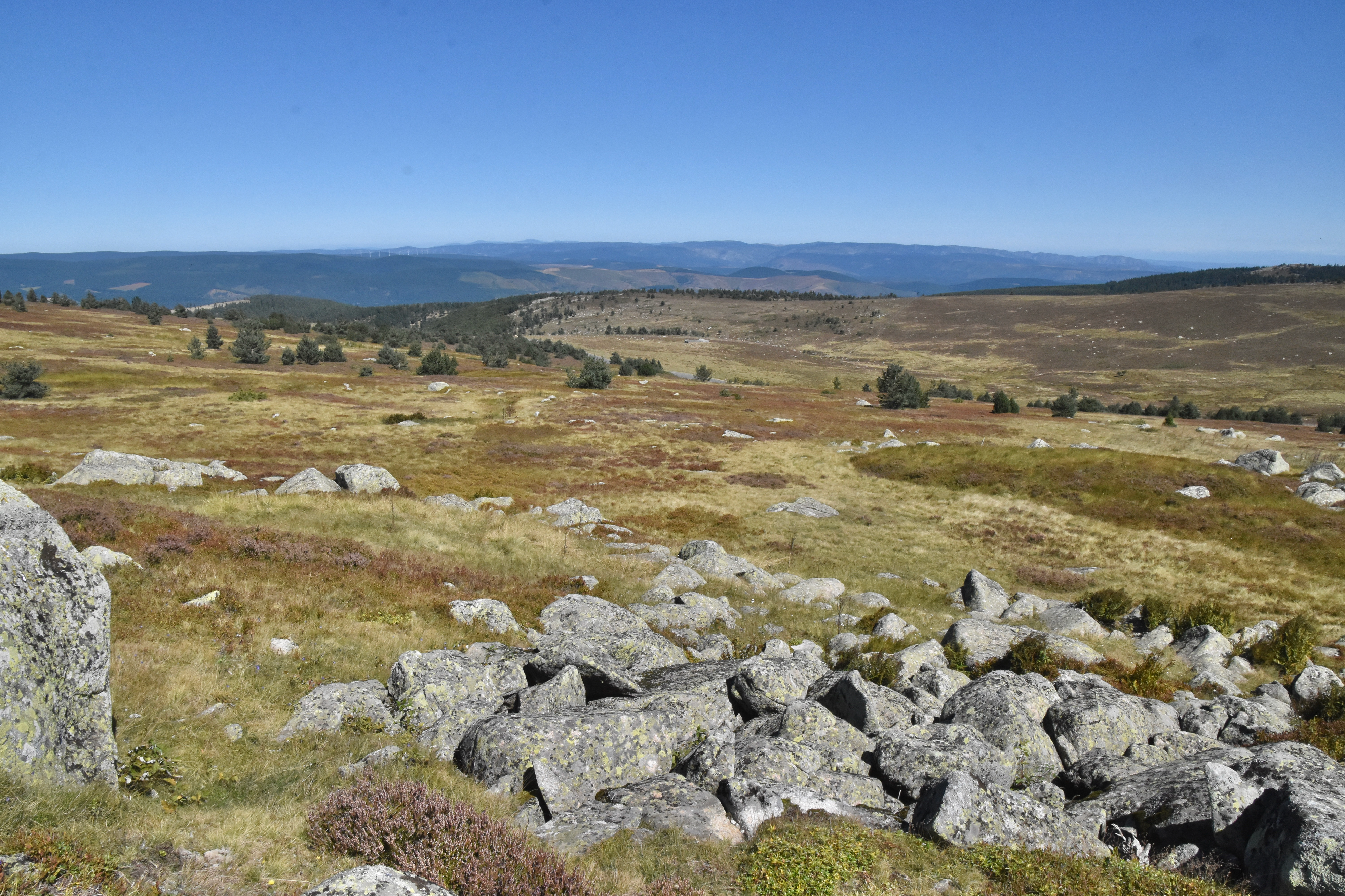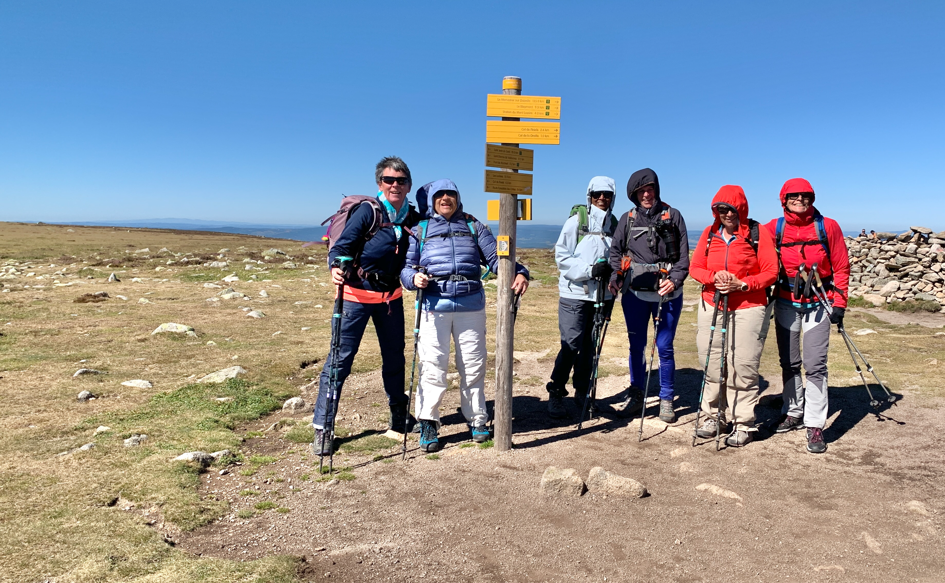 Aujourd’hui, en passant au col de Finiels, nous avons atteint le point culminant de la semaine mais aussi celui du mont Lozère chaîne montagneuse s'étendant de Florac à Villefort, dans le sens est-ouest, et du Bleymard au Pont-de-Monvert dans le sens nord-sud. Le Mistral nous bouscule, il faut être bien attentives pour rester droites. Rhododendrons au feuillage automnal, ciel bleu, la montée est rude à lutter contre ces éléments que sont la pente et le vent.