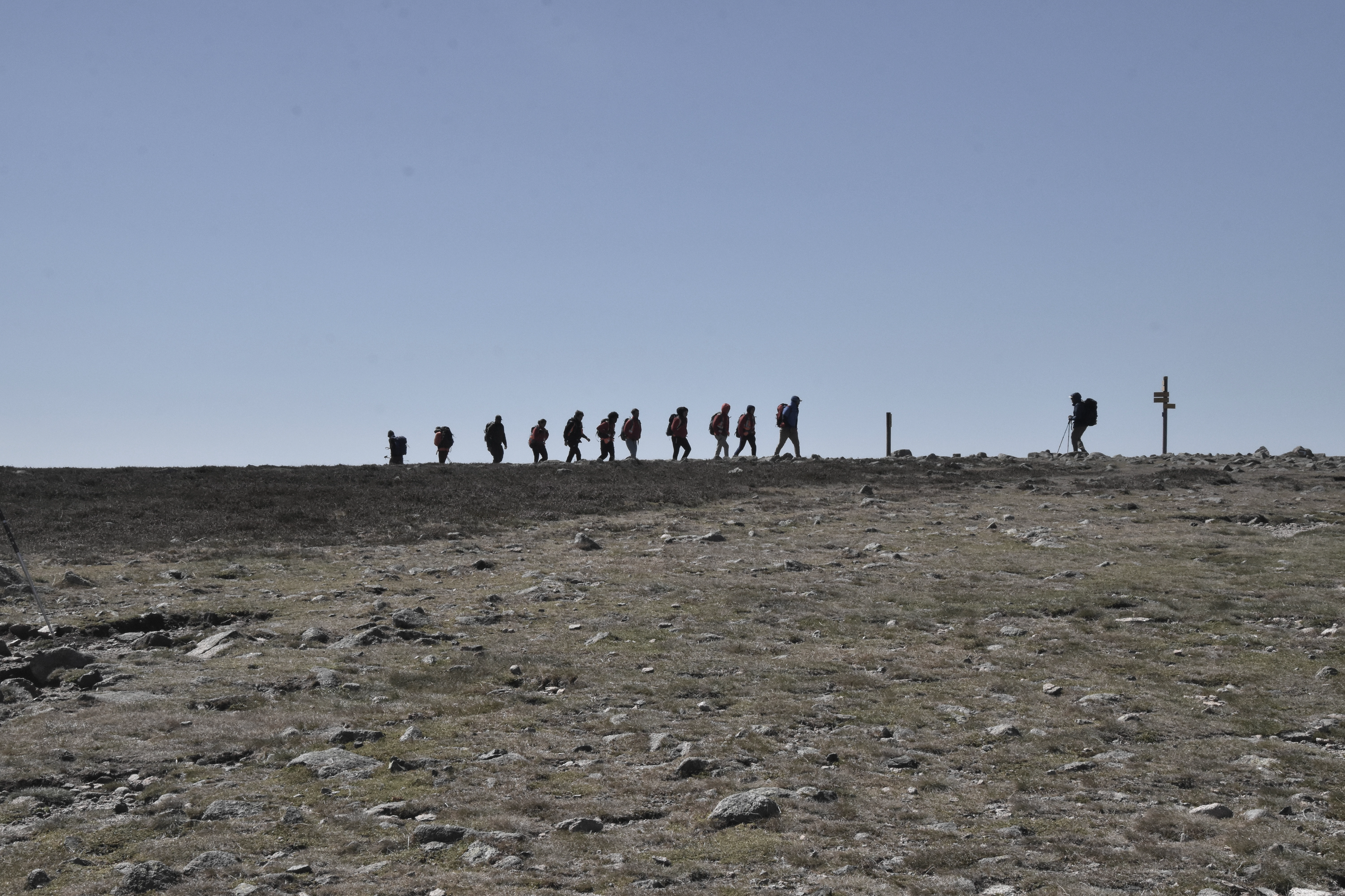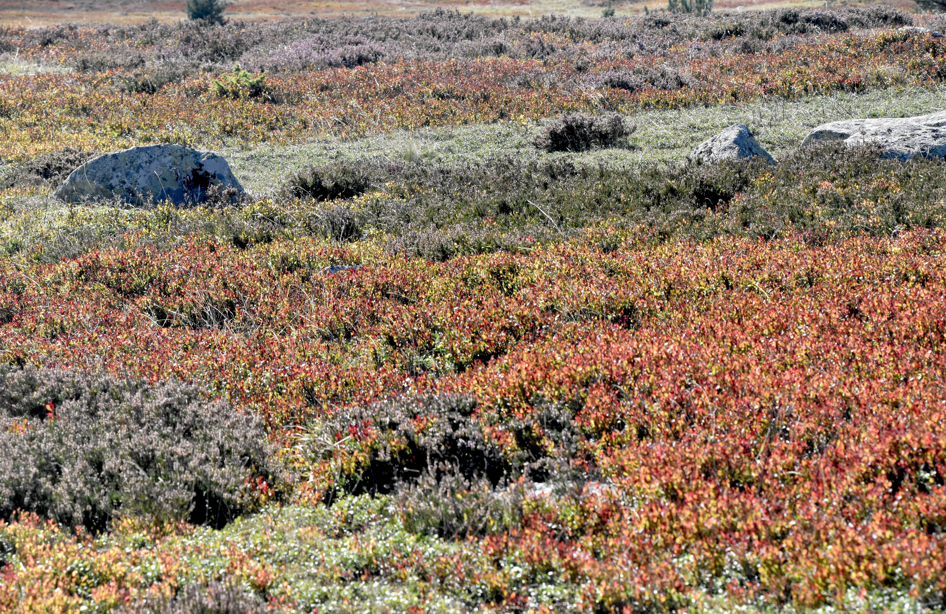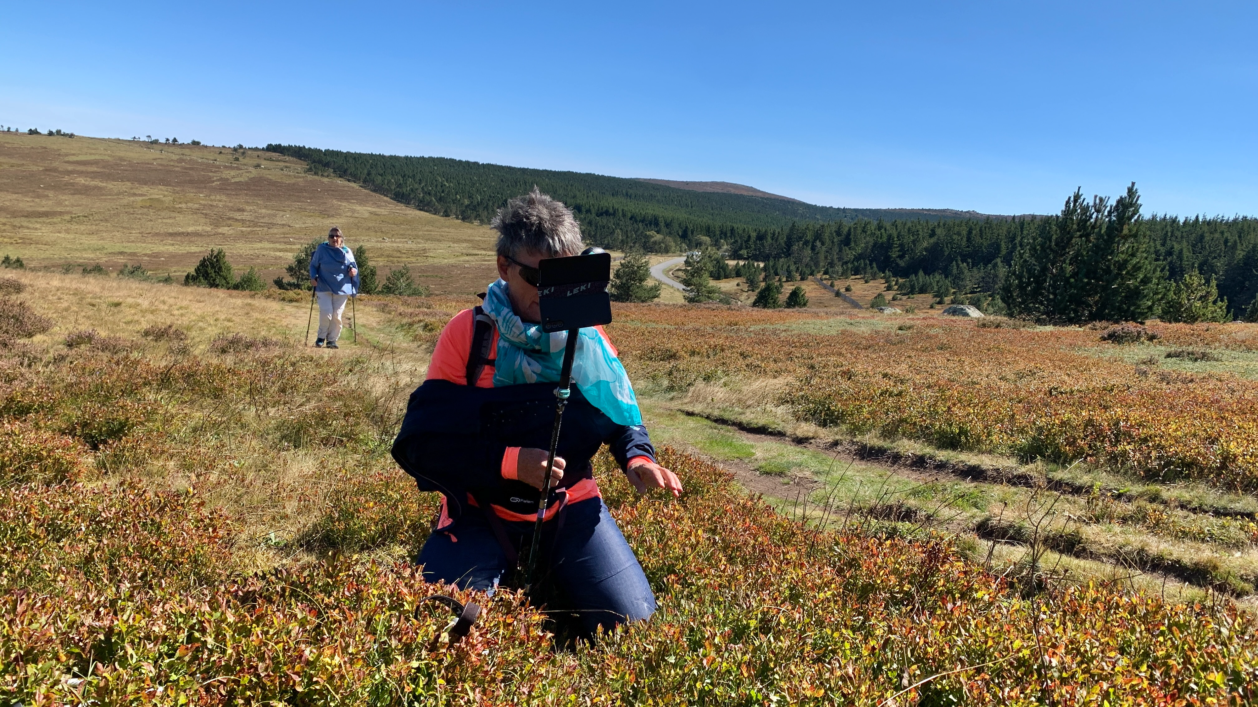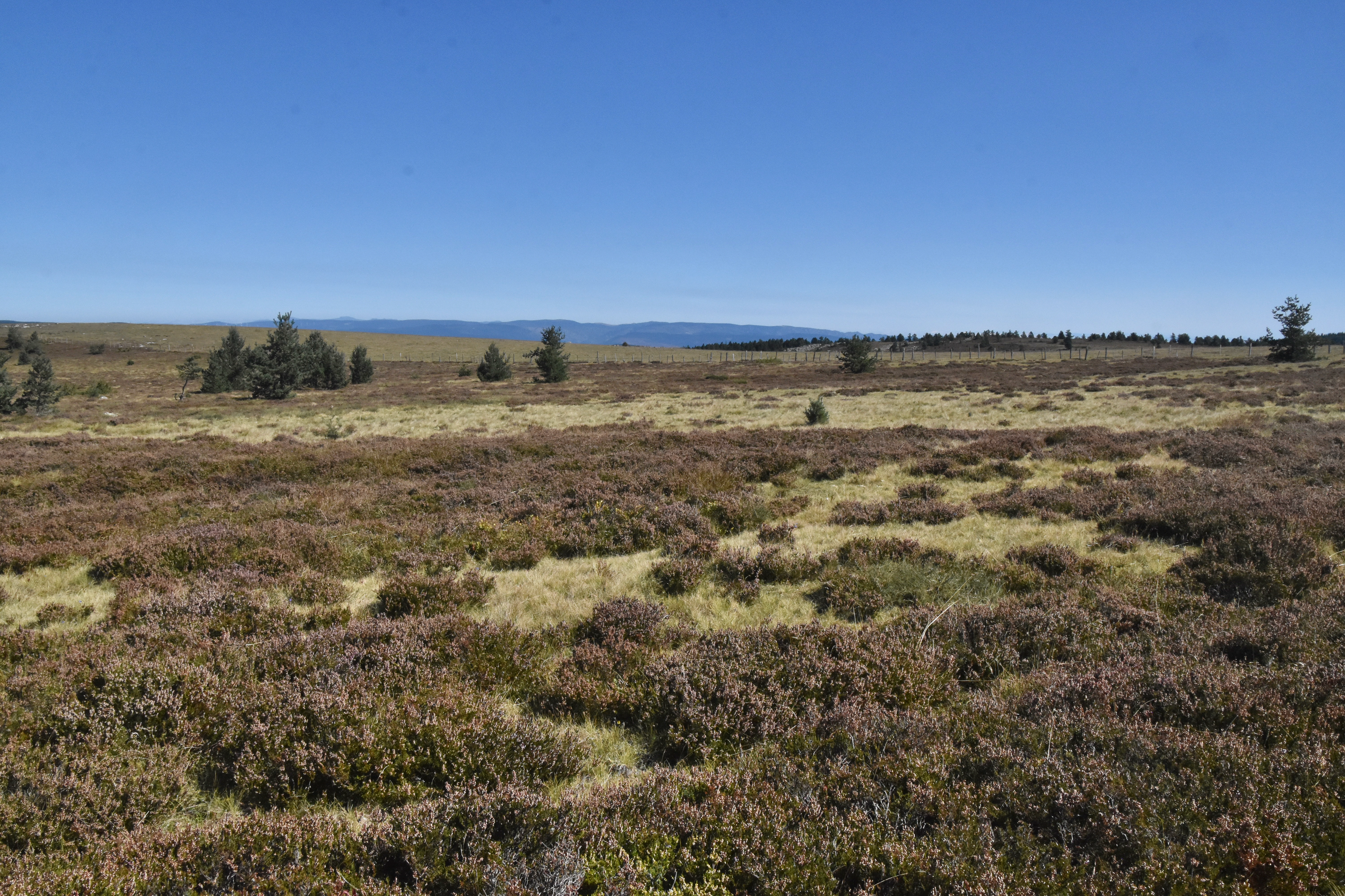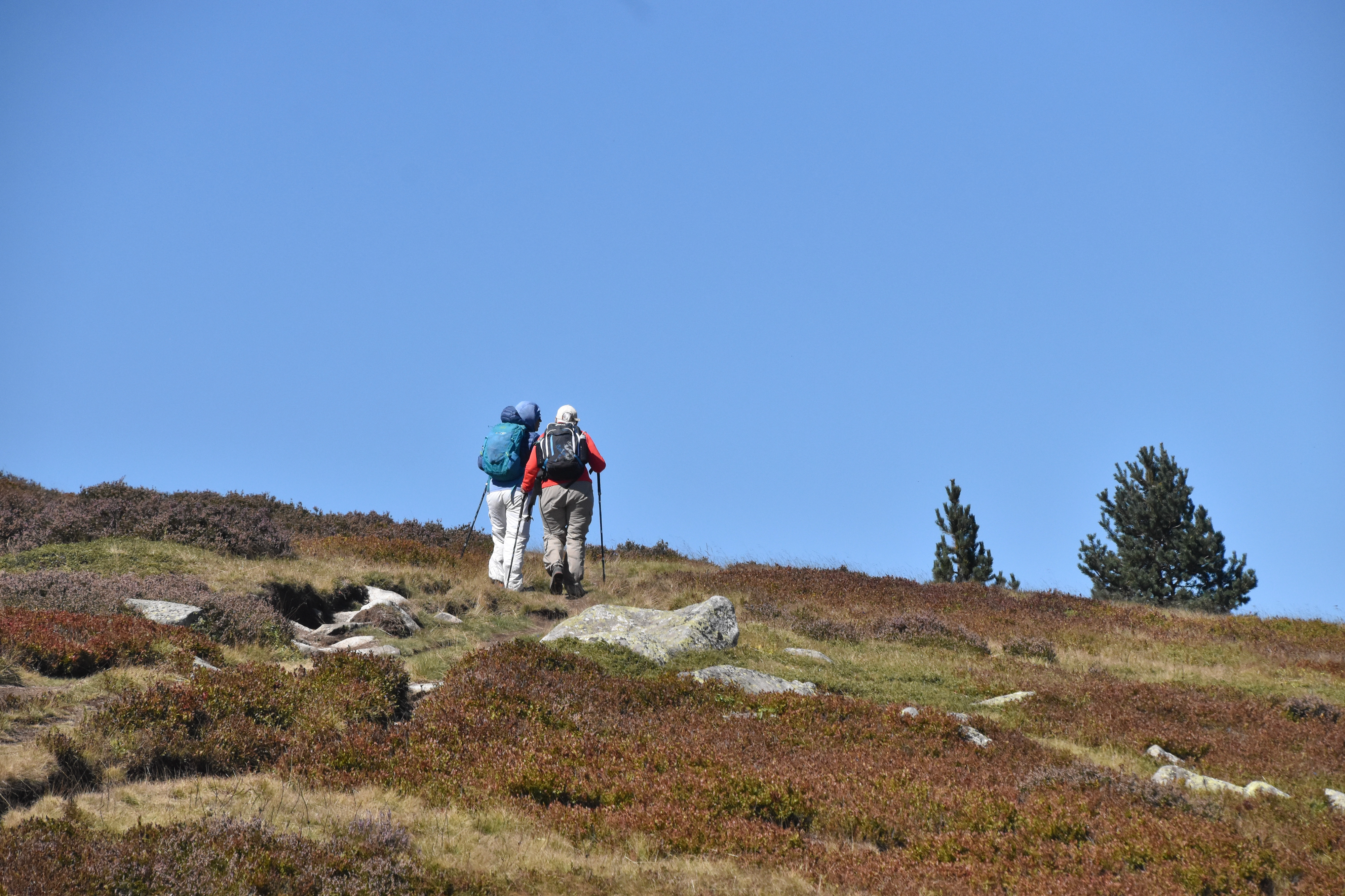 Aujourd’hui, en passant au col de Finiels, nous avons atteint le point culminant de la semaine mais aussi celui du mont Lozère chaîne montagneuse s'étendant de Florac à Villefort, dans le sens est-ouest, et du Bleymard au Pont-de-Monvert dans le sens nord-sud. Le Mistral nous bouscule, il faut être bien attentives pour rester droites. Rhododendrons au feuillage automnal, ciel bleu, la montée est rude à lutter contre ces éléments que sont la pente et le vent.
