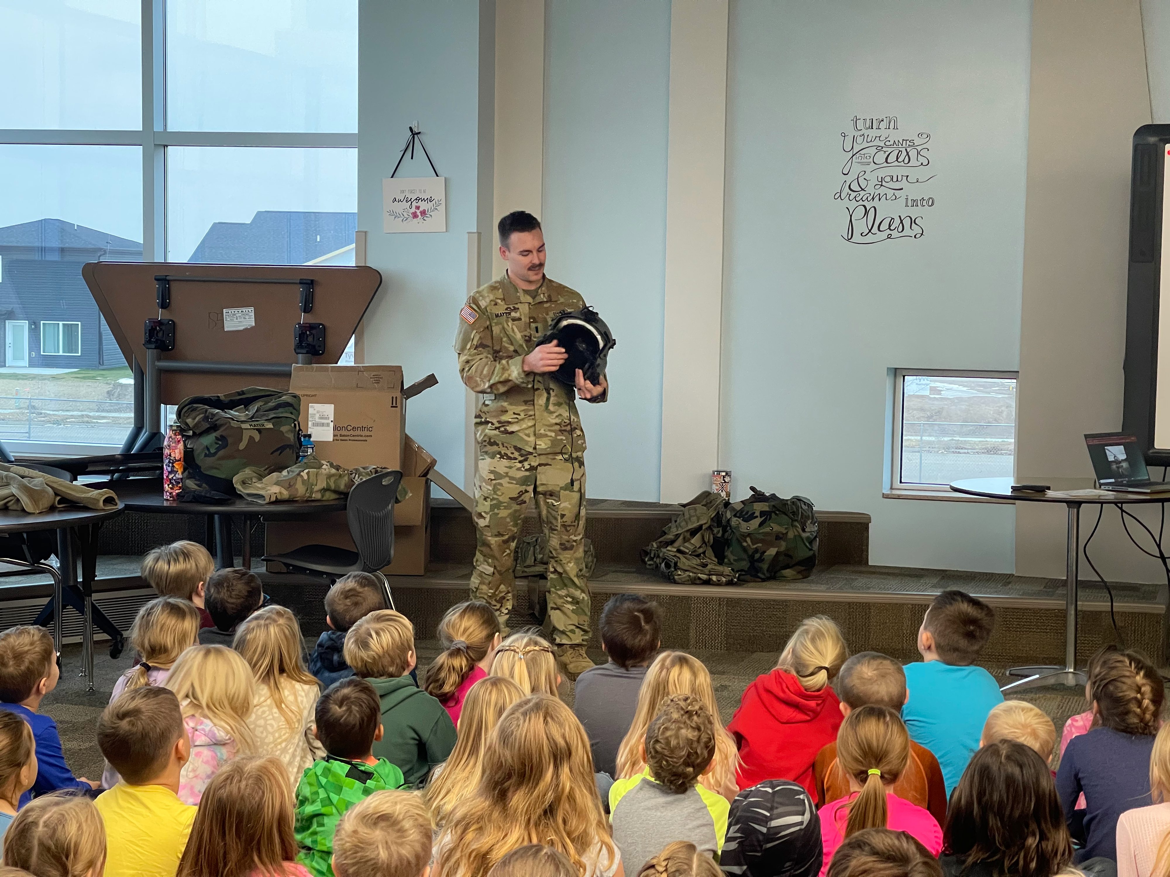 1st Lt. Justin Mayer, Company C, 2nd Battalion, 285th Aviation Regiment, discusses the features of his flight helmet at Lincoln Elementary School. Nov. 9, 2022, Lincoln, N.D. (National Guard photos by Sgt. Maari Beck, 1st Battalion, 112th Aviation Regiment)